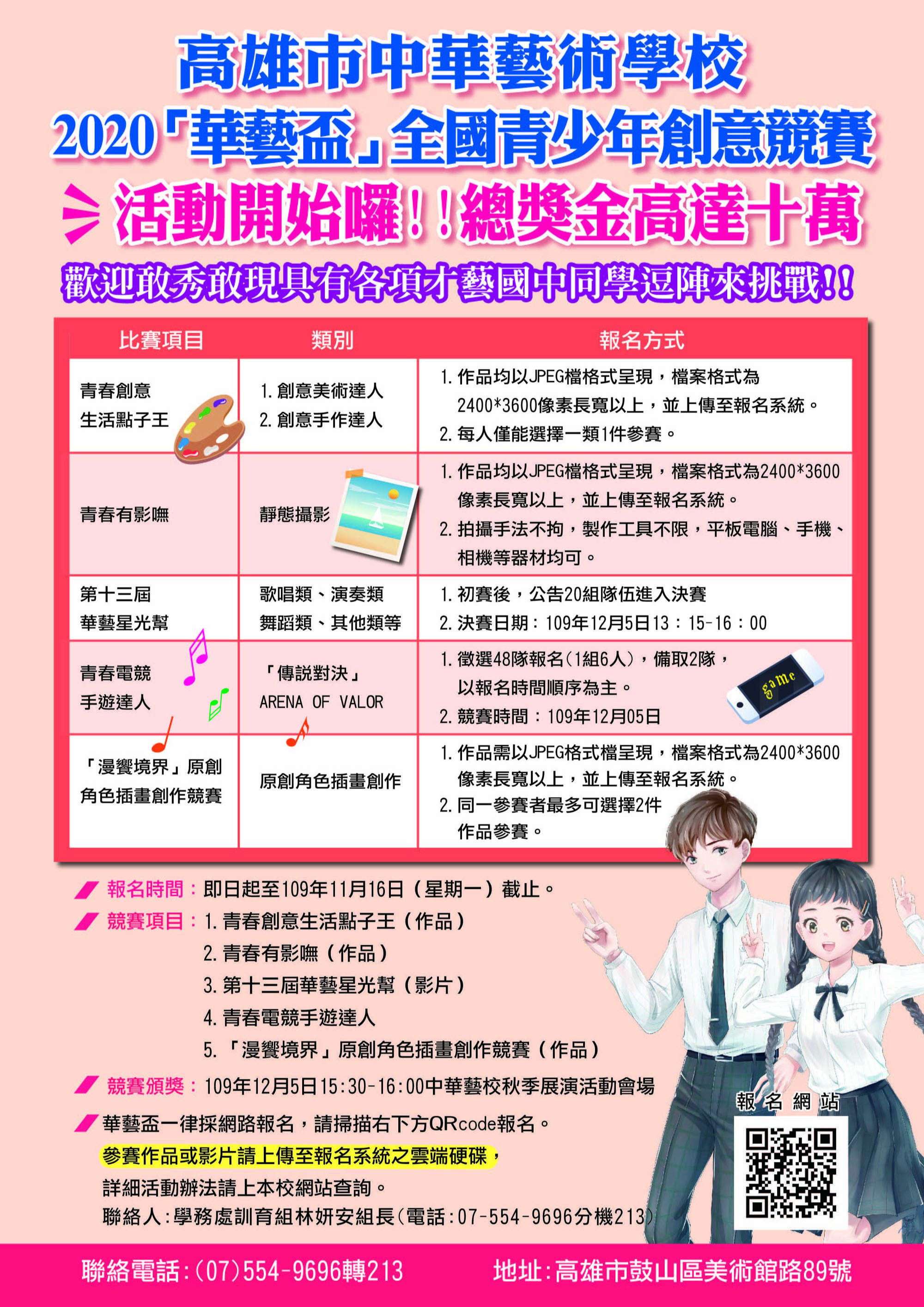 主旨:2020年「華藝盃」全國青少年創意競賽,敬請惠予公告周知鼓勵學生參賽,請查照。