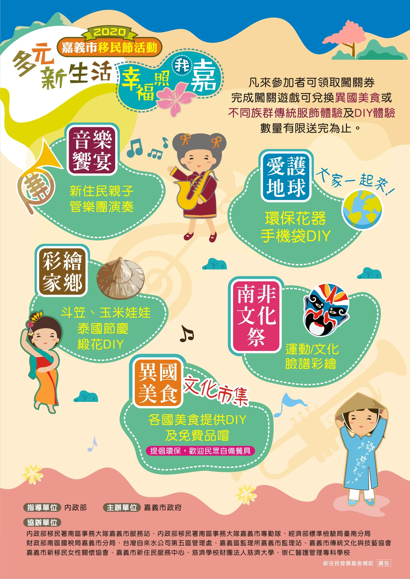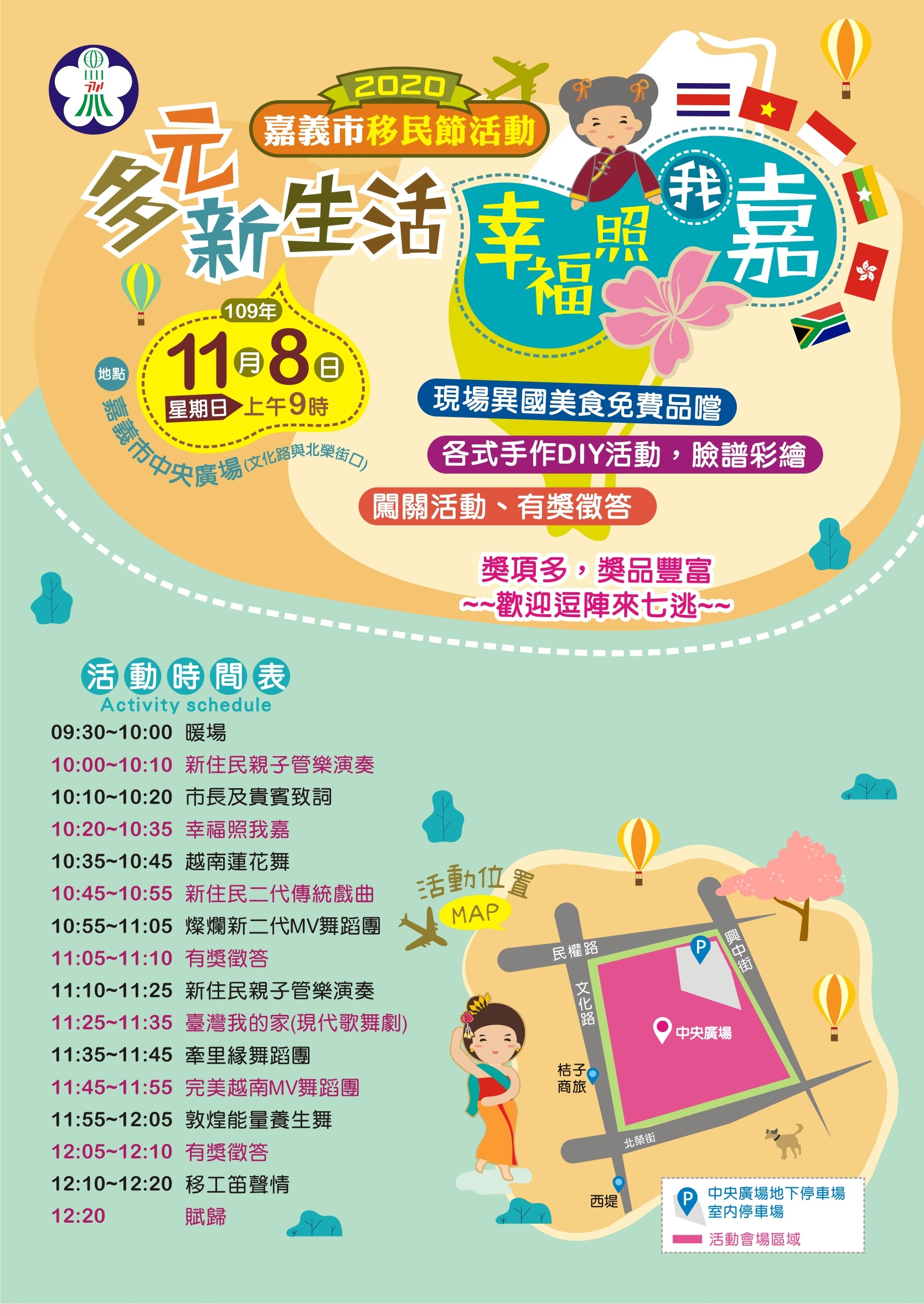 2020「多元新生活‧幸福照我嘉」移民節活動11月8日上午於本市中央廣場舉行,邀約一起體驗多元文化饗宴