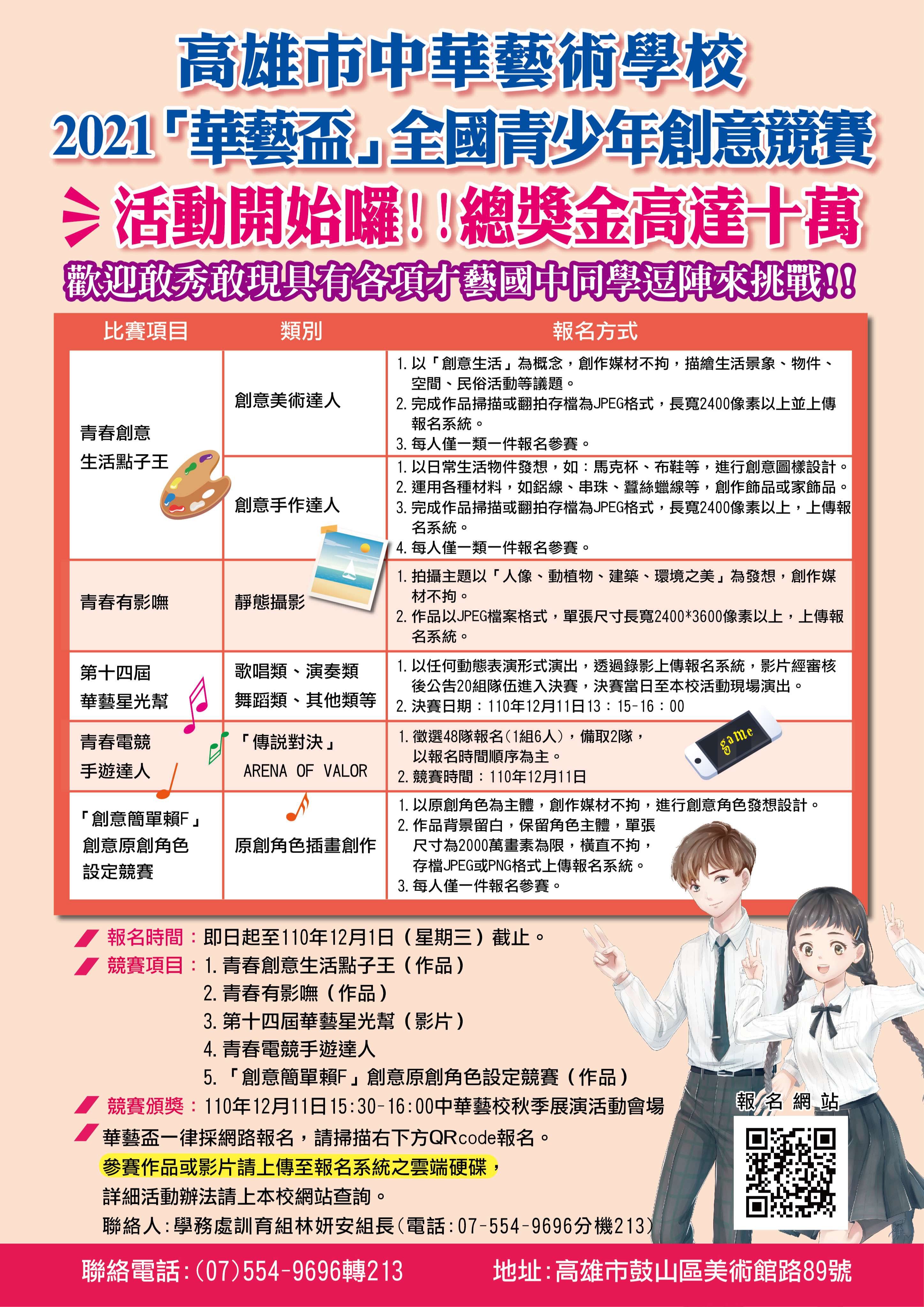 高雄市私立中華高級藝術職業學校辦理2021秋季展演「華藝盃」全國青少年創意競賽,有興趣同學請參閱下方說明,自行報名