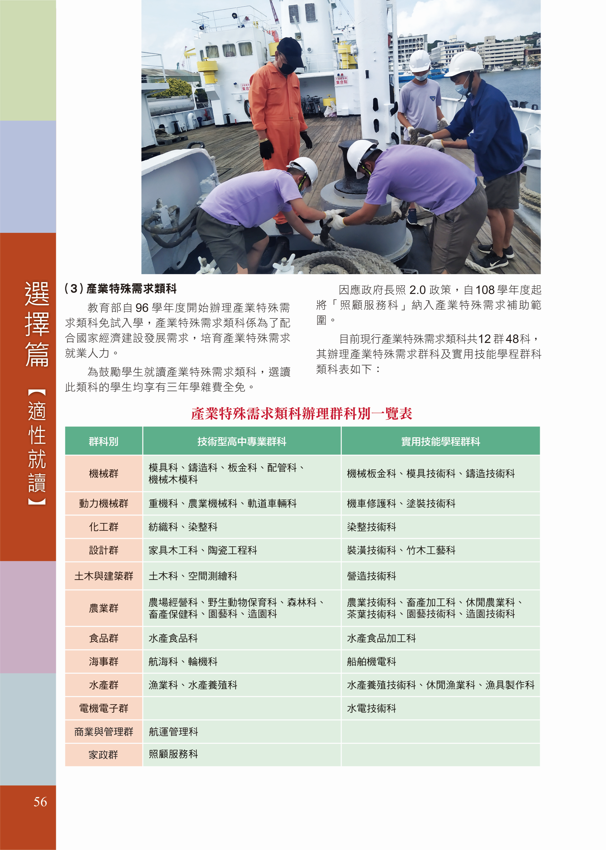 該宣導手冊第56頁,產業特殊需求類科辦理群科別一覽表,技術型高中專業群科之家政群「家政服務科」係誤植,更正為「照顧服務科」,如附件。