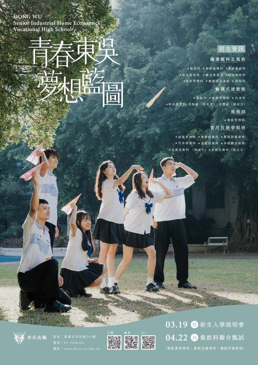 四、本活動為免費參加,有意參與的家長及學生,可由「東吳高職資訊網-線上報名系統」、東吳高職社群(FB、IG)或直接來電報名05-2246161。