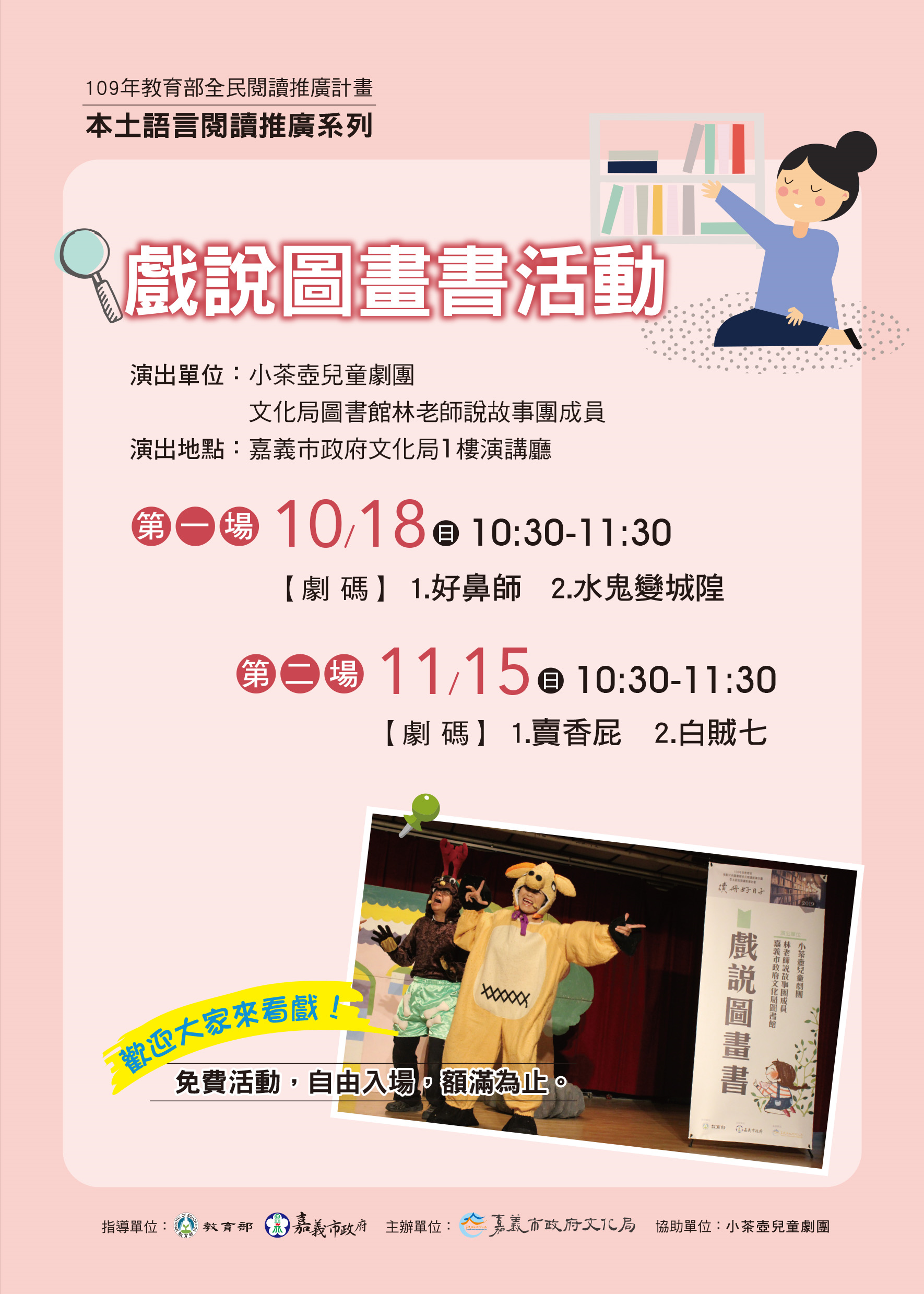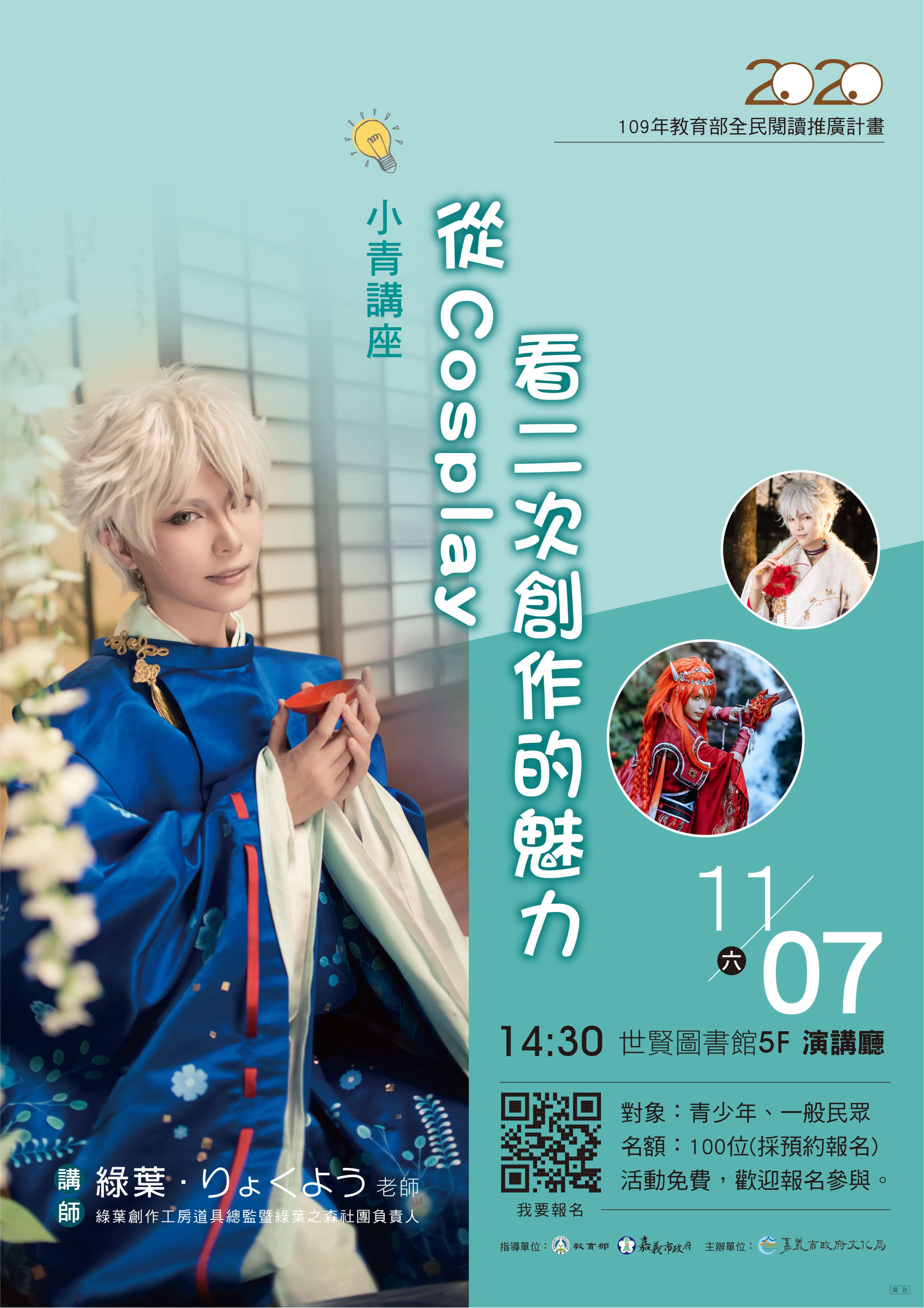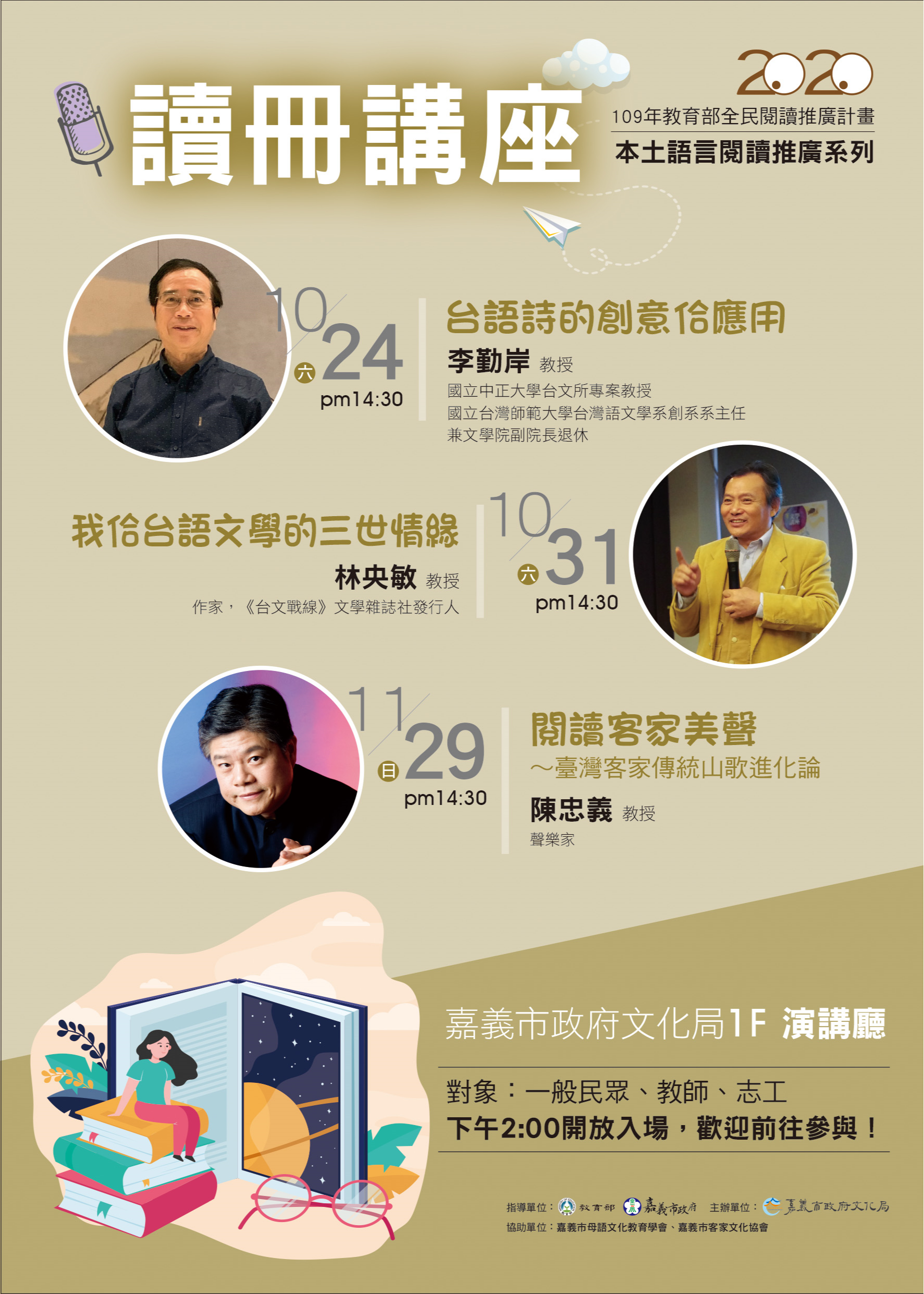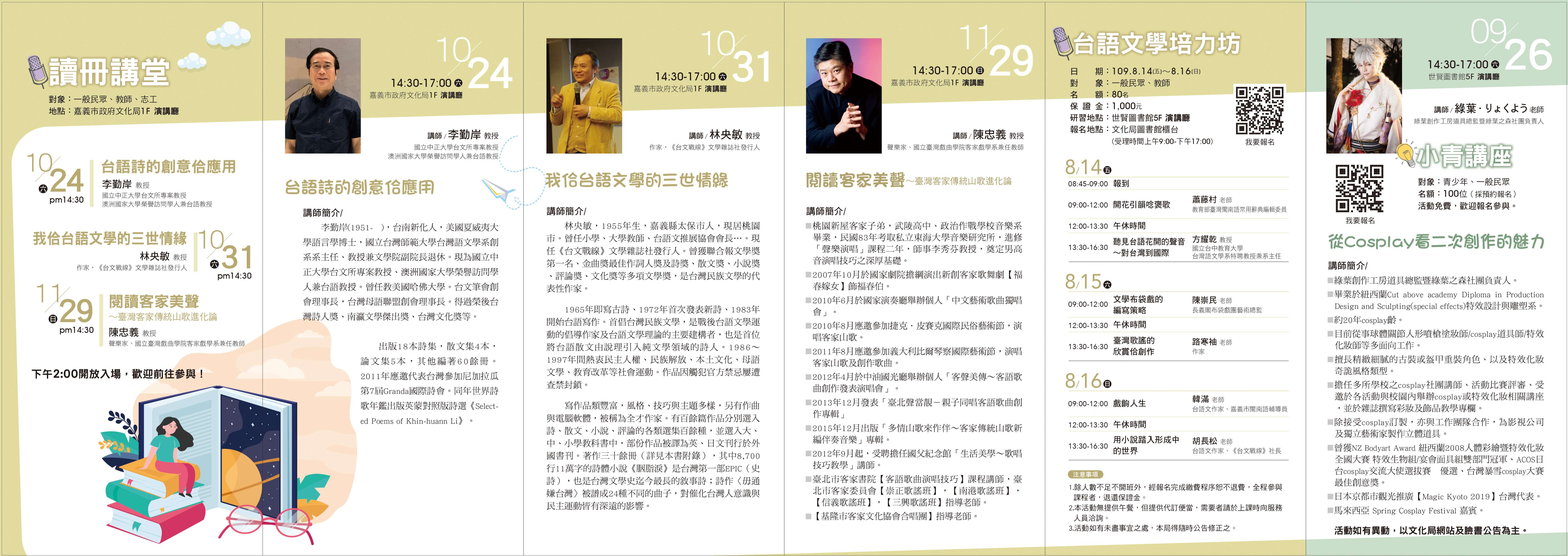 嘉義市文化局109年辦理多元閱讀與本土語言閱讀推廣計畫─「小青講座」、「讀冊講堂」及「戲說圖畫書」活動海報電子檔3式