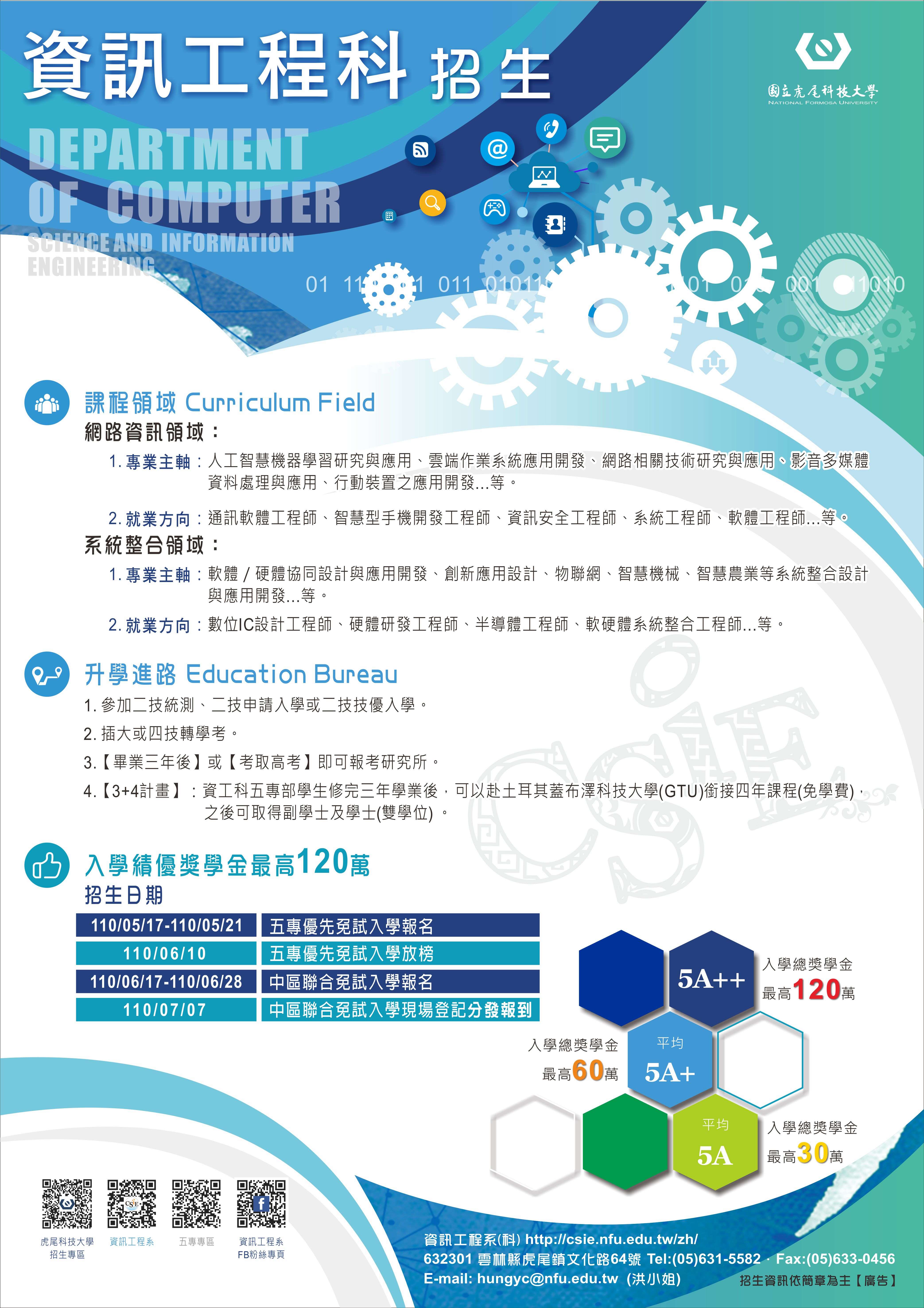 二、該校資訊工程系五專學制「資訊工程科」將於110學年度招收新生,名額共計40名。