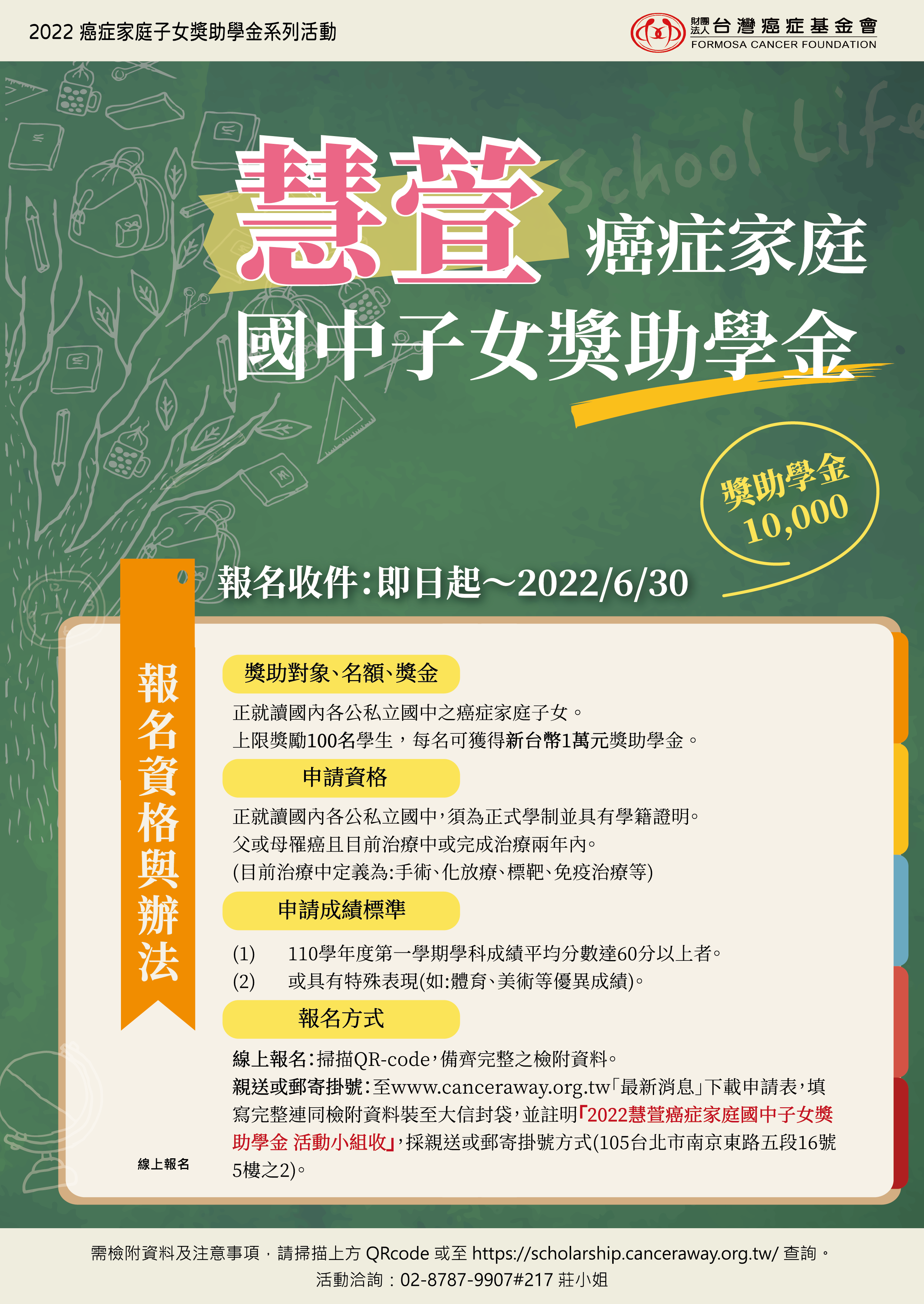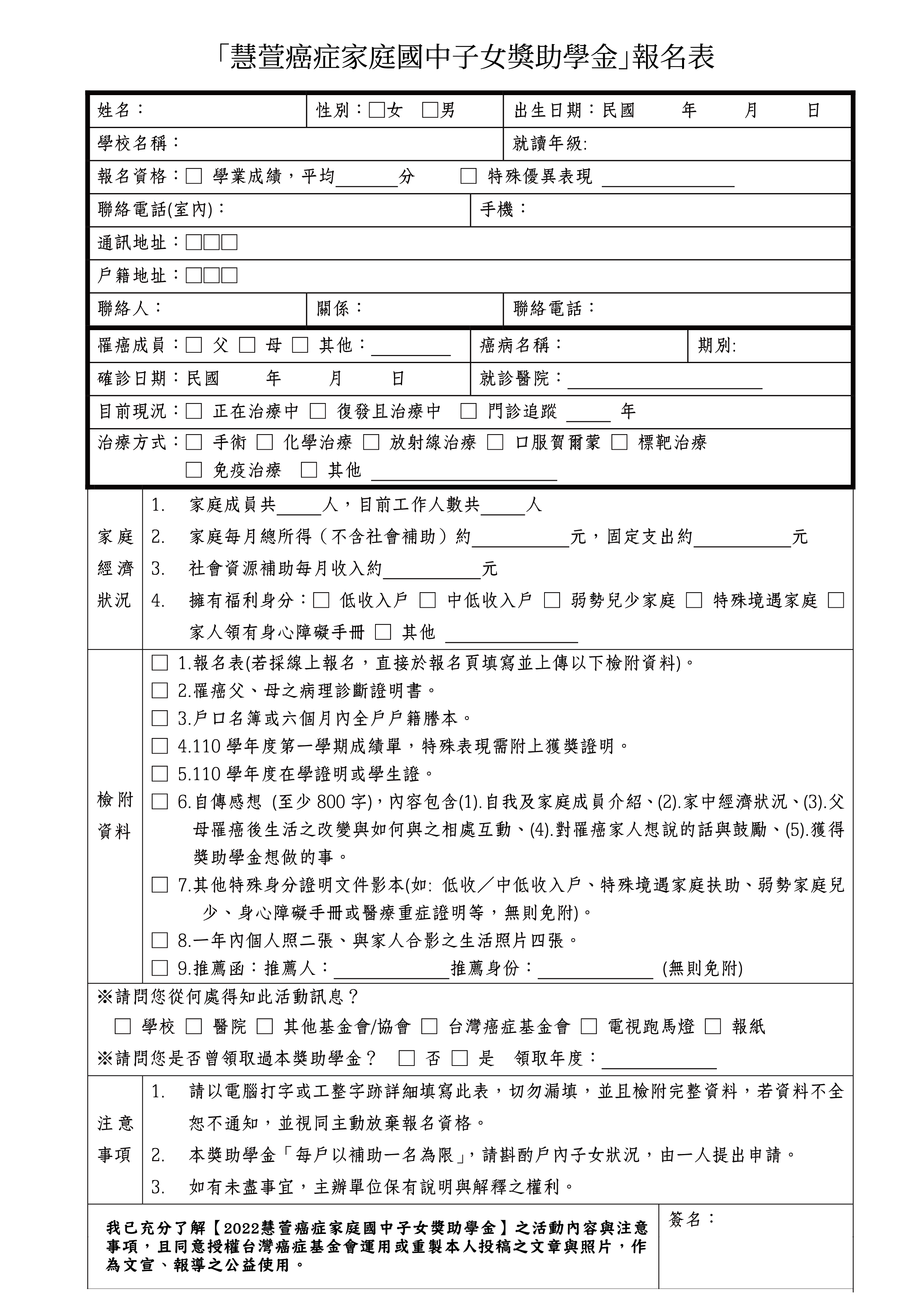 三、檢附「2022慧萱癌症家庭國中子女獎助學金」活動DM及報名表。