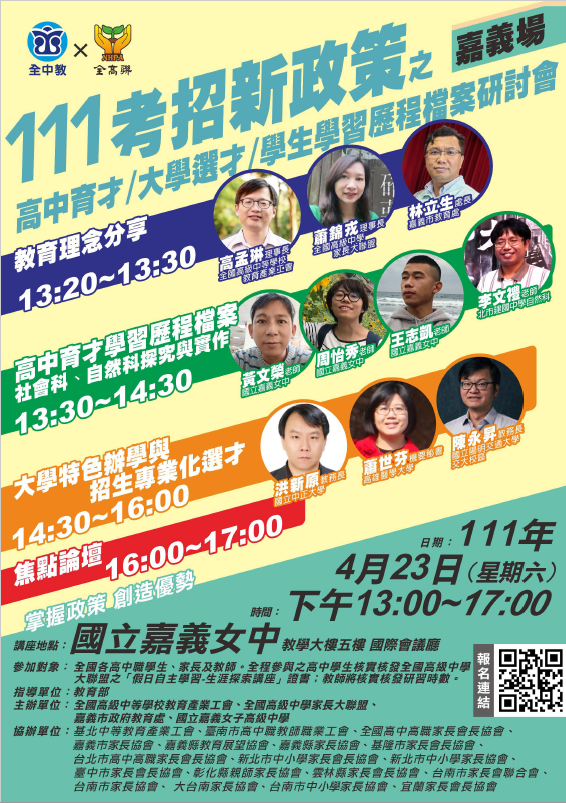 二、本會於111年4月23日(星期六)下午,假國立嘉義女中辦理之「大學111考招新政策之大學選才高中育才學習歷程檔案推廣計畫-嘉義場」研討會,內容摘要如下:(實施計畫及活動海報如附件)