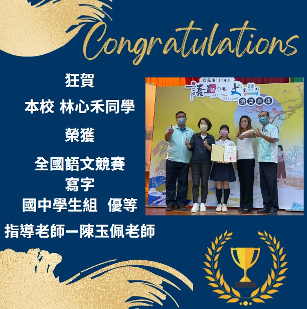 恭喜本校706林心禾 榮獲 全國語文競賽 寫字 國中學生組【優等】。