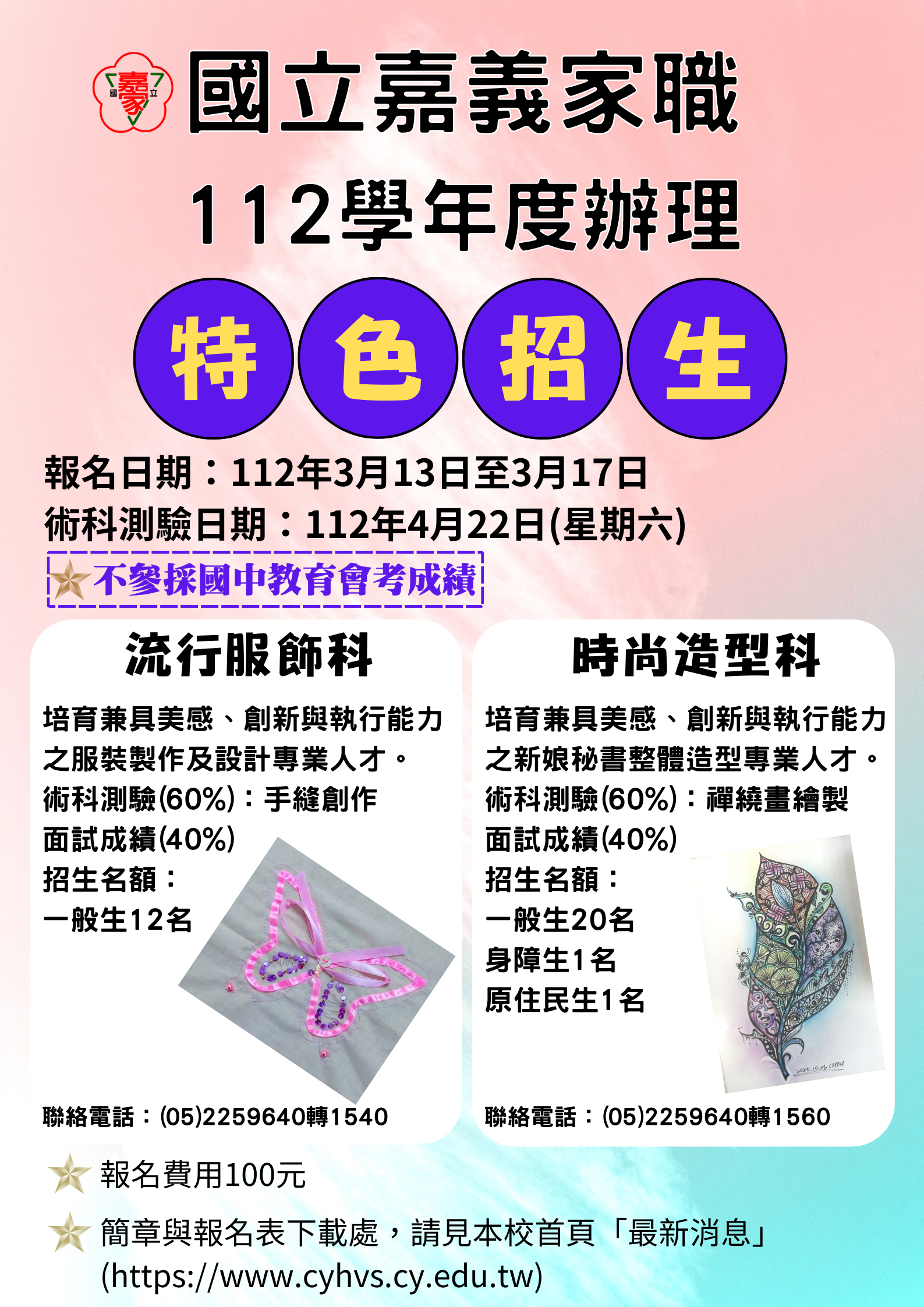五、本校112學年度特色招生專業群科甄選入學簡章及報名表已公告於學校首頁,開放查詢或下載列印,請有意報考學生務必詳閱簡章內容。