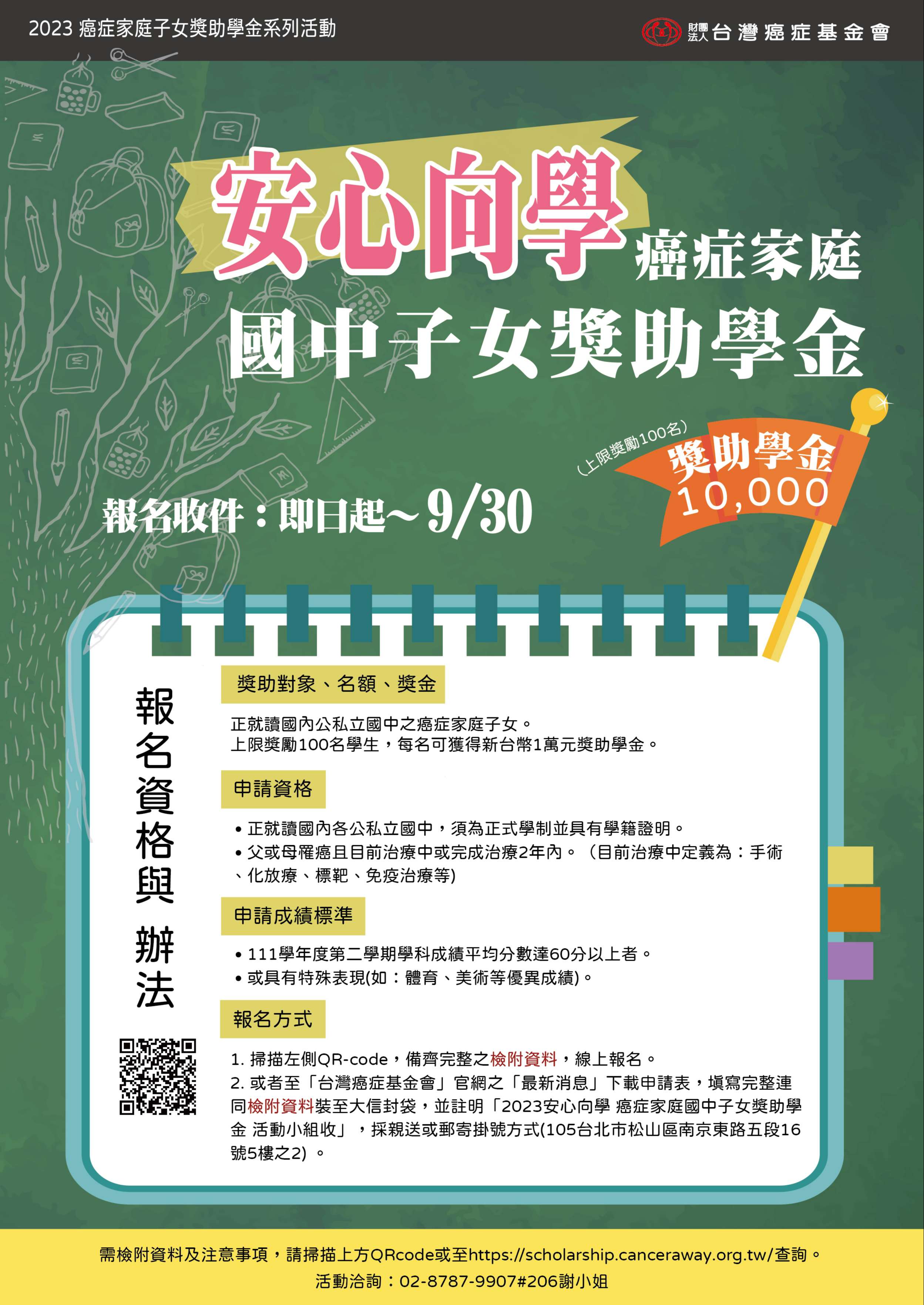 (二)獎助對象、名額、金額:就學國中之癌症家庭子女,獎勵名額上限100名學生,每名可獲得1萬元獎助學金。