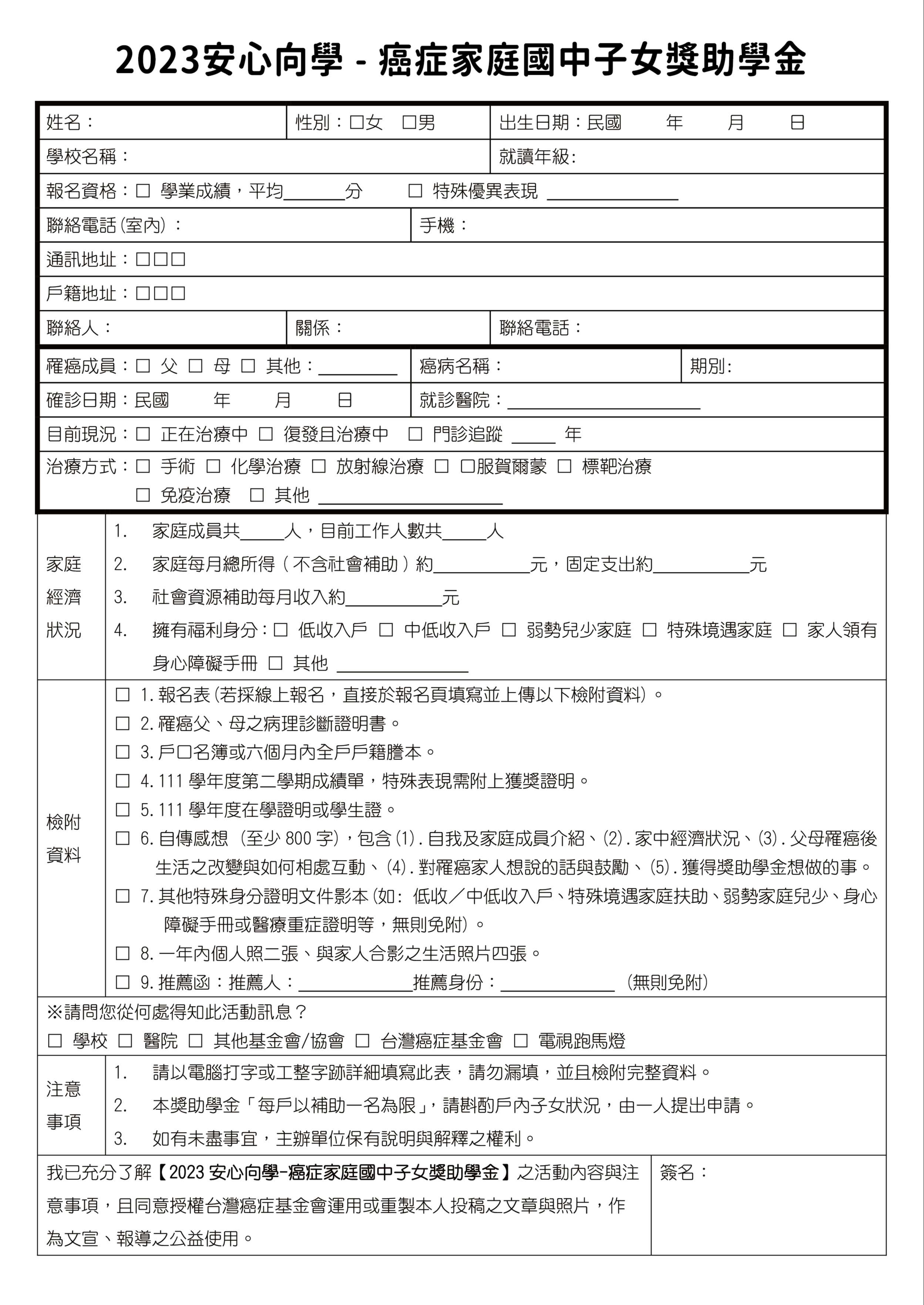 2、掛號郵寄:至該會官網「最新消息」下載申請表,填寫完整連同檢附資料寄至105台北市南京東路五段16號5樓之2,並註明「2023癌症家庭國中子女獎助學金活動小組收」。