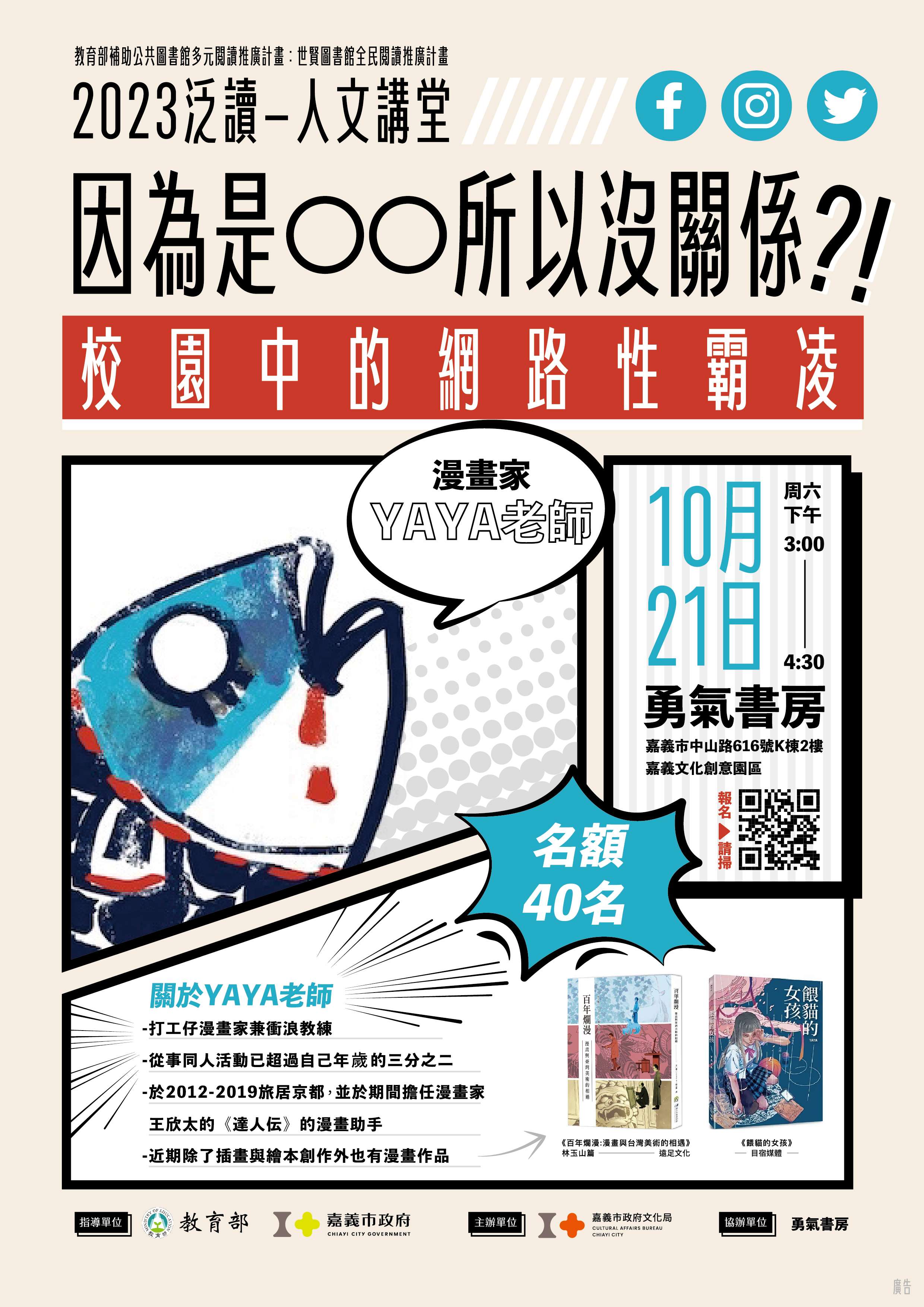 一、性別平等教育教導孩子「認識自己,也尊重他人」,尊重與包容不同性別的差異,因為認識,所以理解,因為理解,互相尊重,希望藉由傳遞性平教育的精神,用知識教育孩子,讓社會環境更加友善。本局辦理「泛讀─人文講堂」,以性平教育為閱讀議題,邀請漫畫家YAYA老師及作家諶淑婷老師進行講座分享,請鼓勵所屬踴躍參與。