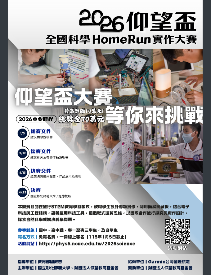 三、「2026仰望盃全國科學HomeRun實作大賽」訂於115年4月25 日(星期六)假國立彰化師範大學舉行,競賽即日起受理 報名,報名截止日期為115年1月5日(星期一)。