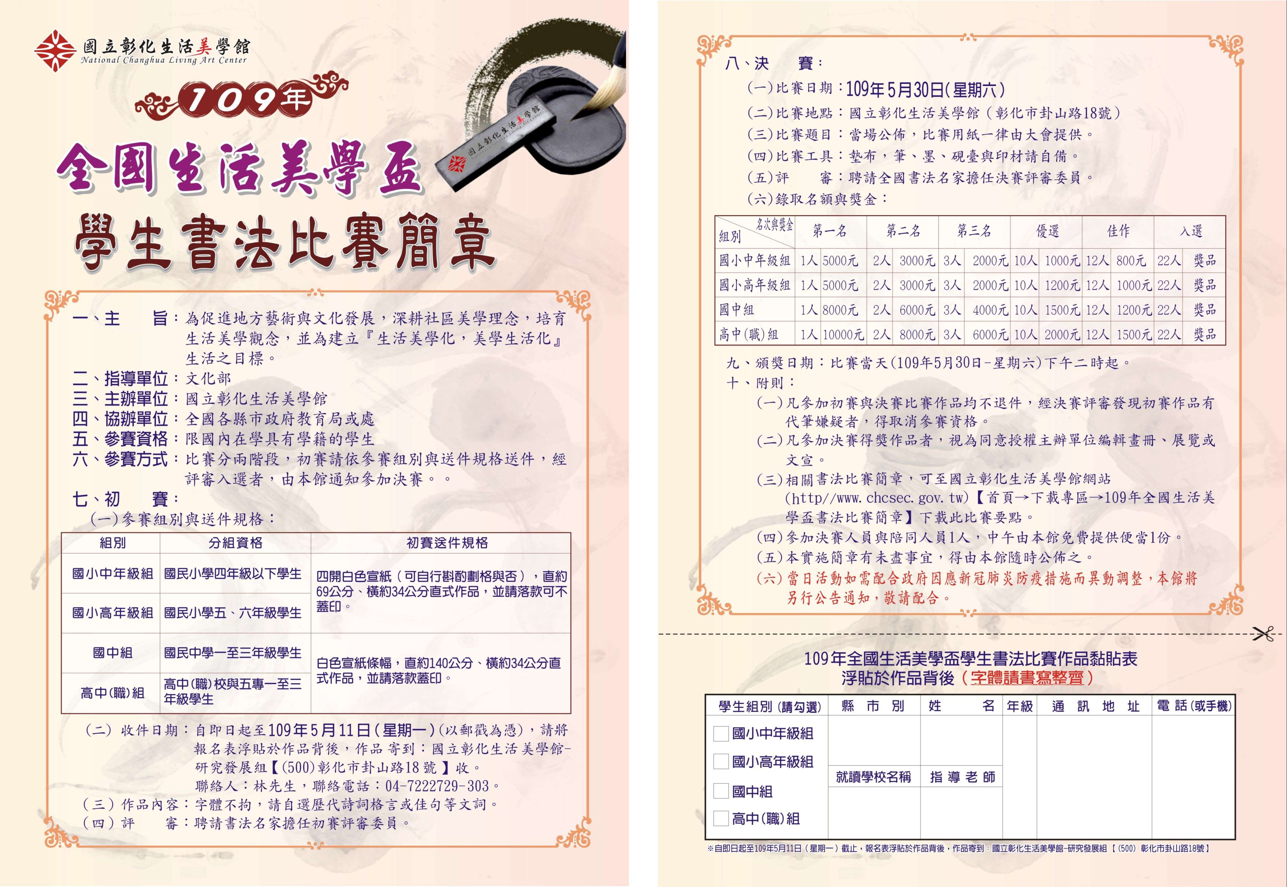 轉知國立彰化生活美學館主辦「109年全國生活美學盃學生書法比賽」,歡迎學生踴躍報名參加