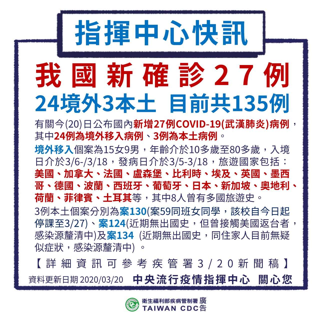 指揮中心快訊:3/20國內外即時疫情,新增24境外、3本土,目前我國共135例!