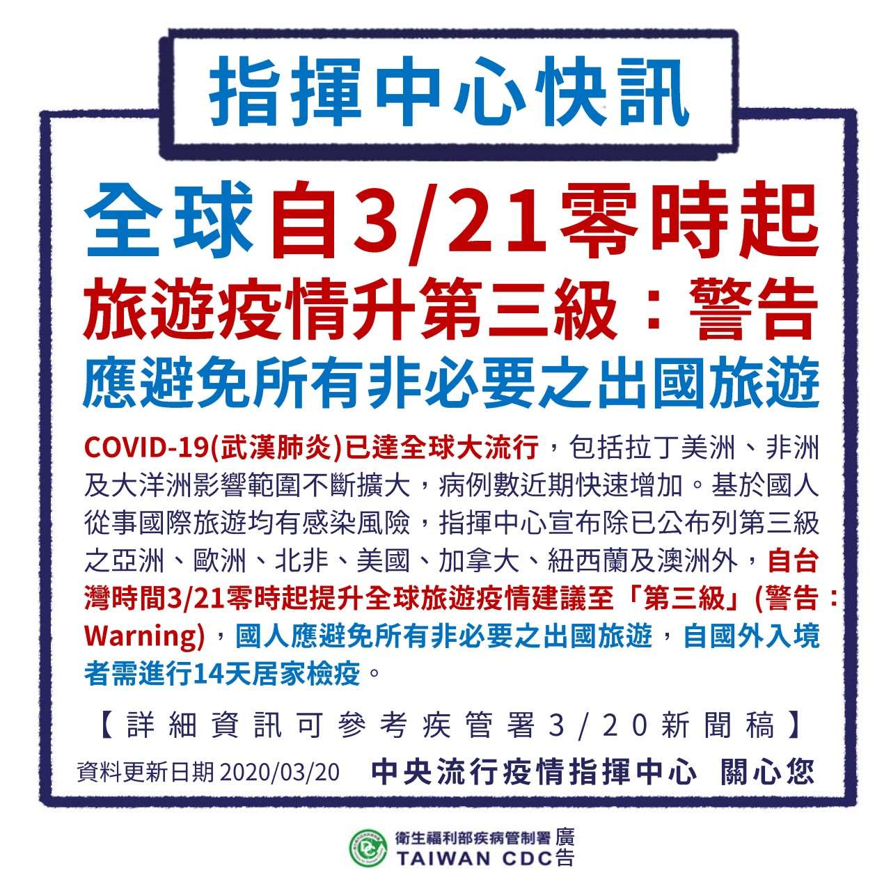 指揮中心3/20宣布除已公布列第三級之亞洲、歐洲、北非、美國、加拿大、紐西蘭及澳洲外,自台灣時間3/21零時起提升全球旅遊疫情建議至「第三級」(警告:Warning),國人應避免所有非必要之出國旅遊,自國外入境者,需進行14天居家檢疫。
