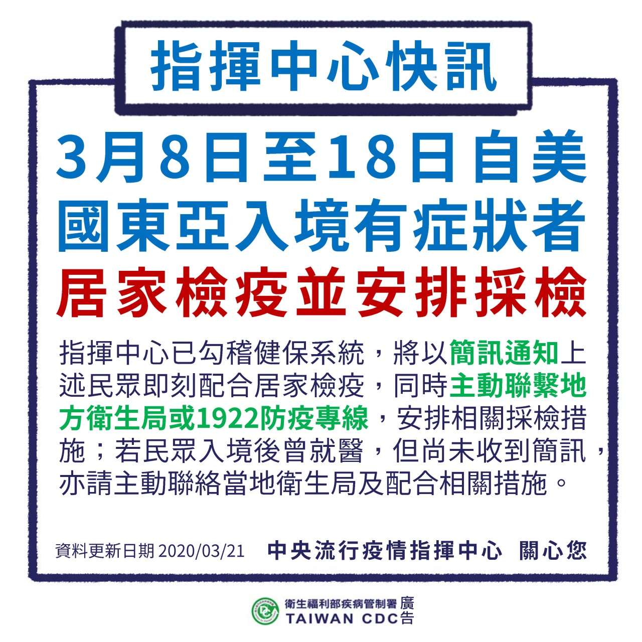 指揮中心快訊:3月8日至18日自美國、東亞入境有症狀者 將居家檢疫並安排採檢!