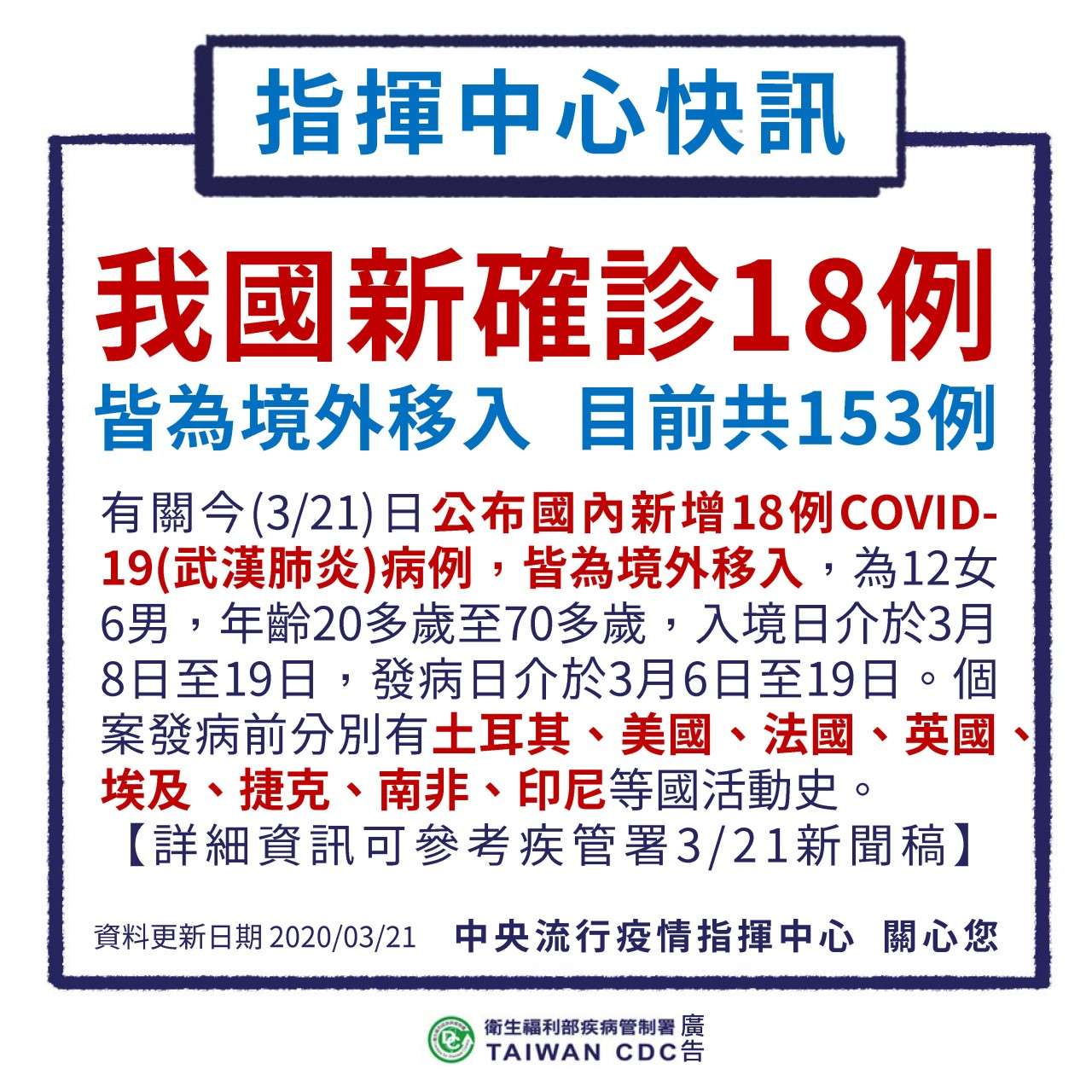 中央流行疫情指揮中心今(21)日公布國內新增18例COVID-19(武漢肺炎)病例,均為境外移入,為12女6男,年齡20多歲至70多歲,入境日介於3月8日至19日,發病日介於3月6日至19日。個案發病前分別有土耳其、美國、法國、英國、埃及、捷克、南非、印尼等國活動史。
