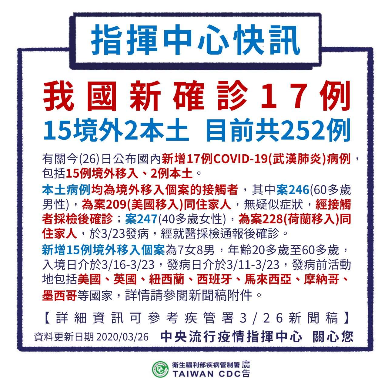 指揮中心快訊:3/26國內外即時疫情,新增15例境外、2例本土,目前我國共252例!