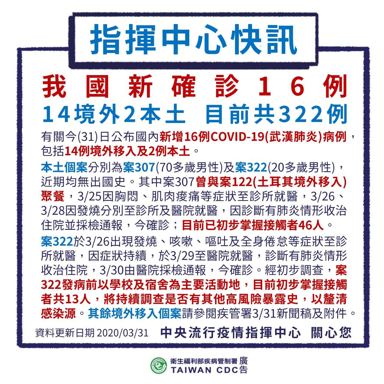 國內目前累計322例確診(今日新增案307至322),分別為276例境外移入及46例本土病例。確診個案中5人死亡,39人解除隔離,其餘持續住院隔離中。