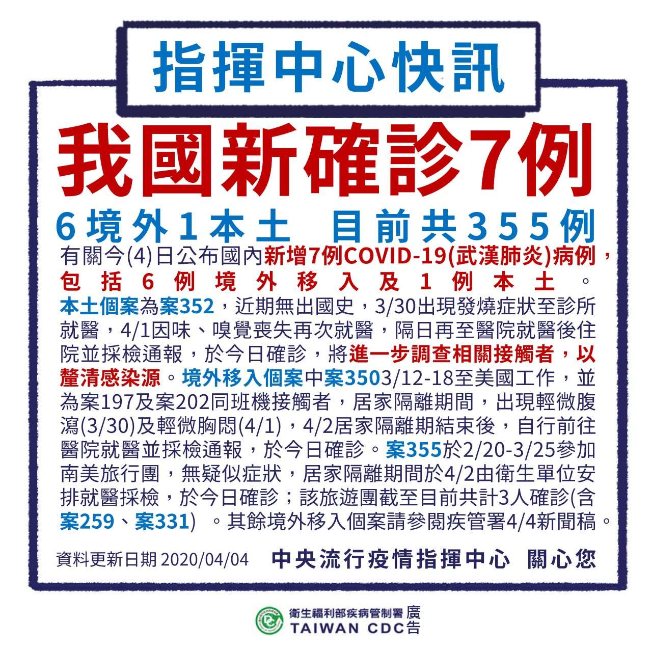 今(4)日公布國內新增7例COVID-19(武漢肺炎)病例(案349至355),分別為6例境外移入及1例本土。