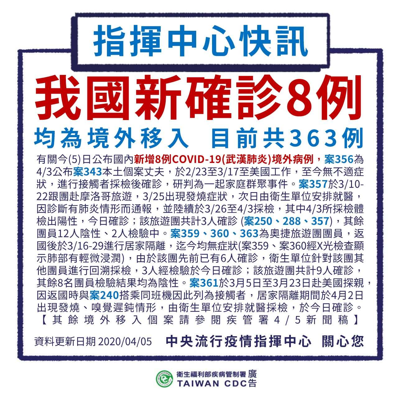 國內目前累計363例確診(今日新增案356至363),分別為312例境外移入及51例本土病例。確診個案中5人死亡,54人解除隔離,其餘持續住院隔離中。