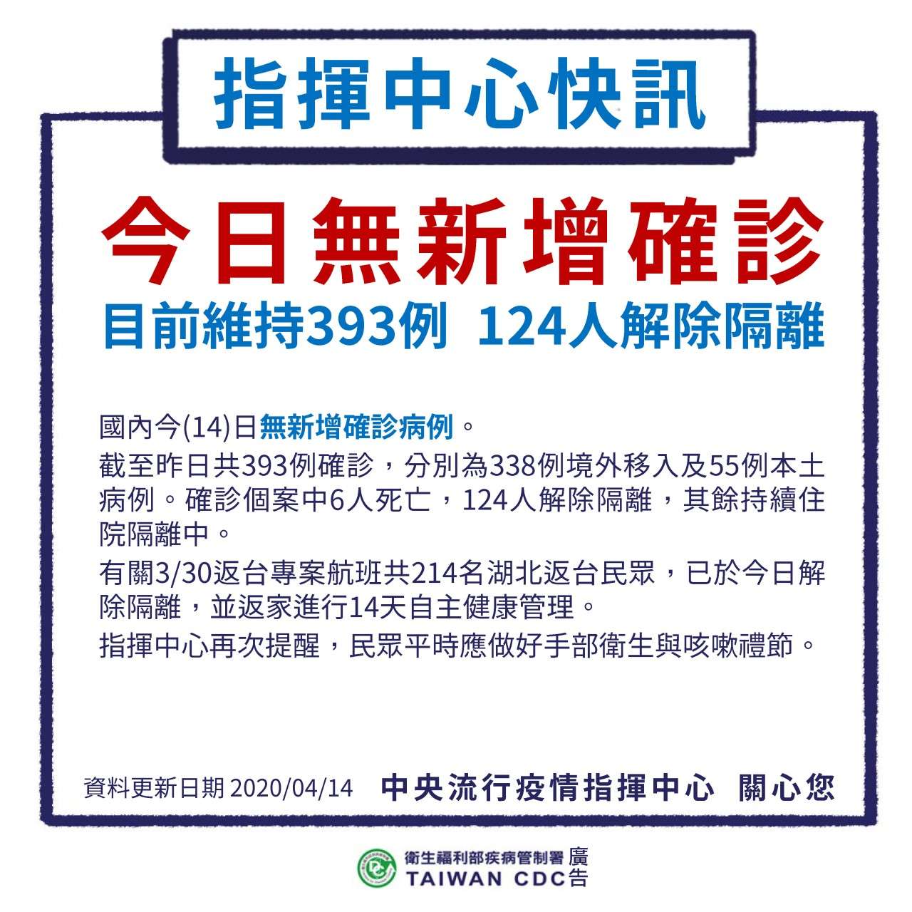 今(14)日無新增確診病例,國內維持393例確診,分別為338例境外移入及55例本土病例。確診個案中6人死亡,124人解除隔離,其餘持續住院隔離中。
