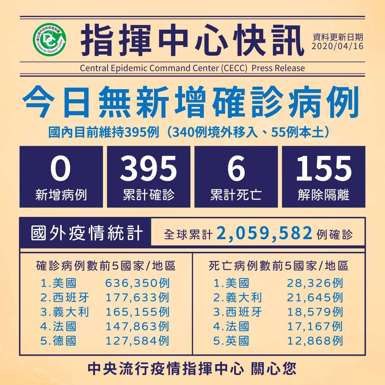 今(16)日無新增確診病例,國內維持395例確診,分別為340例境外移入及55例本土病例。確診個案中6人死亡,155人解除隔離,其餘持續住院隔離中。