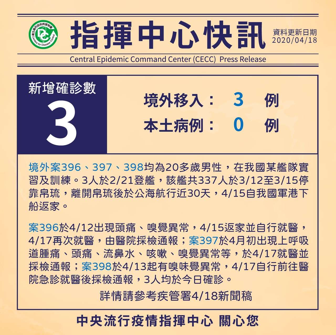 今(18)日新增3例境外移入確診病例,均為20多歲男性,在我國某艦隊實習與訓練。目前國內中398例確診(今日新增案396、397、398),分別為343例境外移入及55例本土病例。確診個案中6人死亡,178人解除隔離,其餘持續住院隔離中。