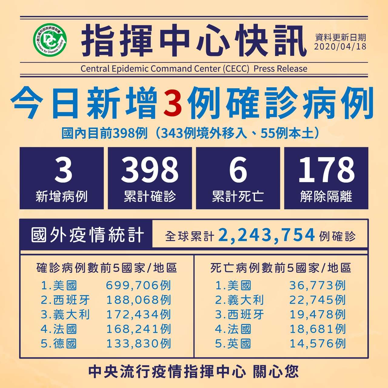 全球累計2,243,754例確診,分布於184個國家/地區;病例數以美國699,706例、西班牙188,068例、義大利172,434例、法國168,241例及德國133,830例為多;病例中152,316例死亡,以美國36,773例、義大利22,745例、西班牙19,478例、法國18,681例及英國14,576例為多。
