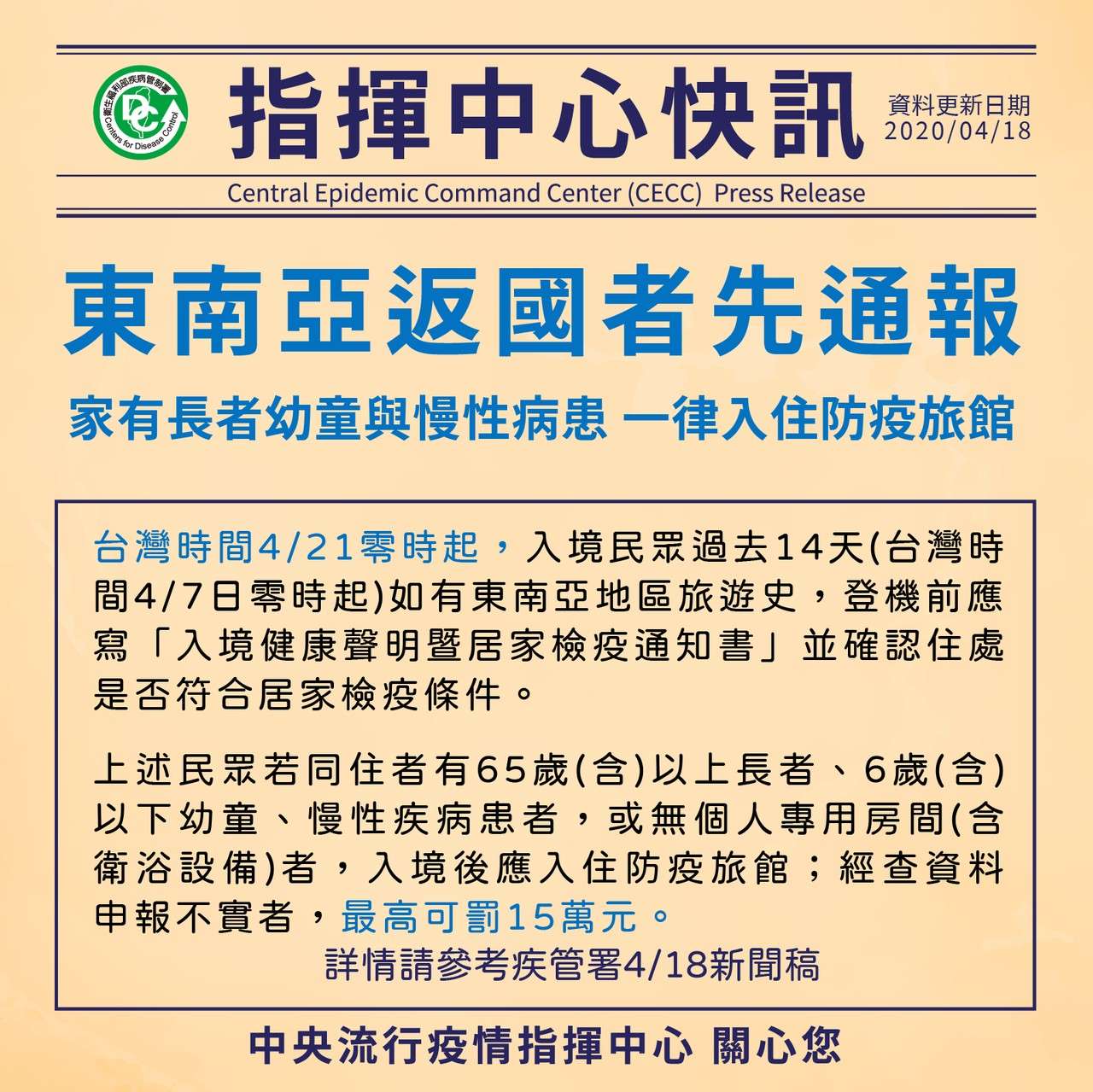 指揮中心快訊:4/18國內外疫情資訊!