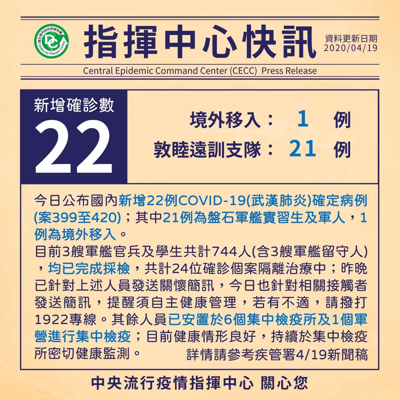 今(19)日新增22例COVID-19(武漢肺炎)確定病例(案399至420);其中21例為盤石軍艦實習生及軍人,1例為境外移入,相關接觸者疫調中,感染源待釐清。
