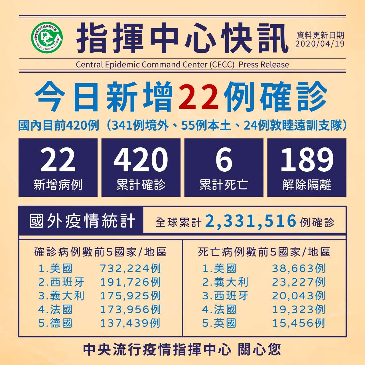 國內目前累計420例確診(今日新增案399至420),分別為341例境外移入、55例本土病例及24例敦睦遠訓支隊。確診個案中6人死亡,189人解除隔離,其餘持續住院隔離中。
