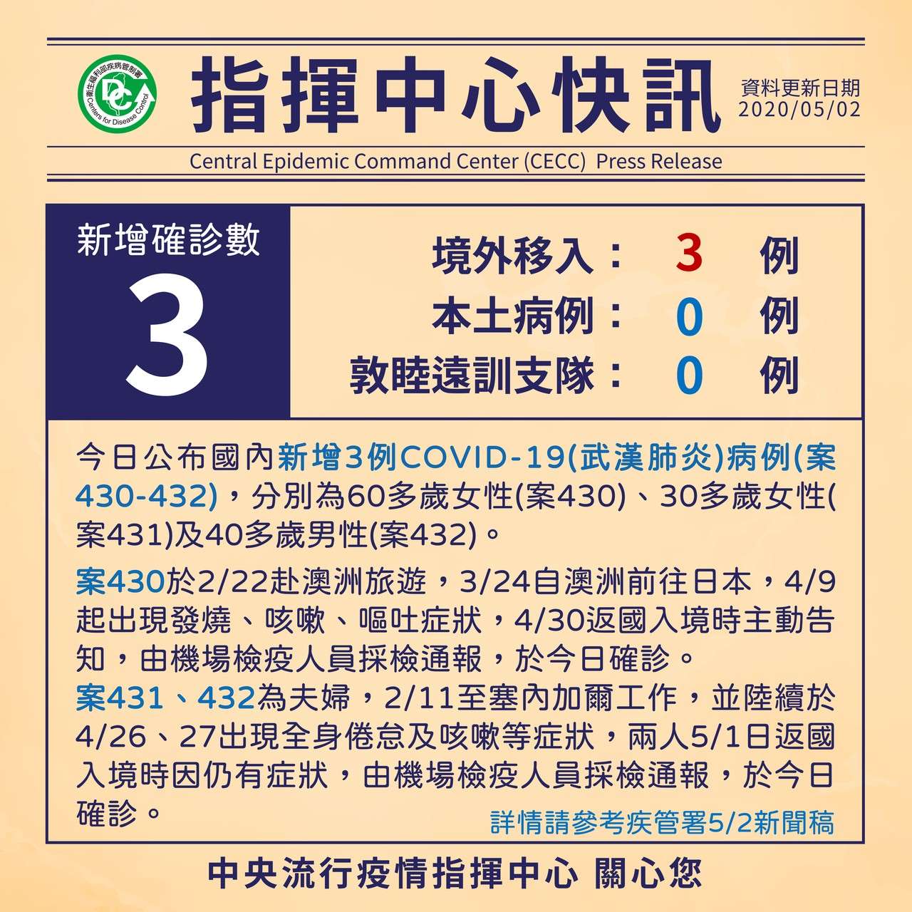 今(2)日公布國內新增3例COVID-19(武漢肺炎)病例 ,分別為60多歲女性(案430)、30多歲女性(案431)及40多歲男性(案432),皆為境外移入個案。