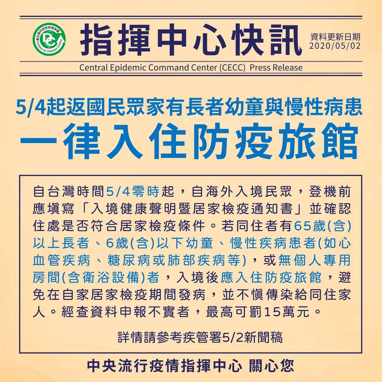 指揮中心快訊:5月4日起海外返國者家有長者幼童與慢性病患一律入住防疫旅館!