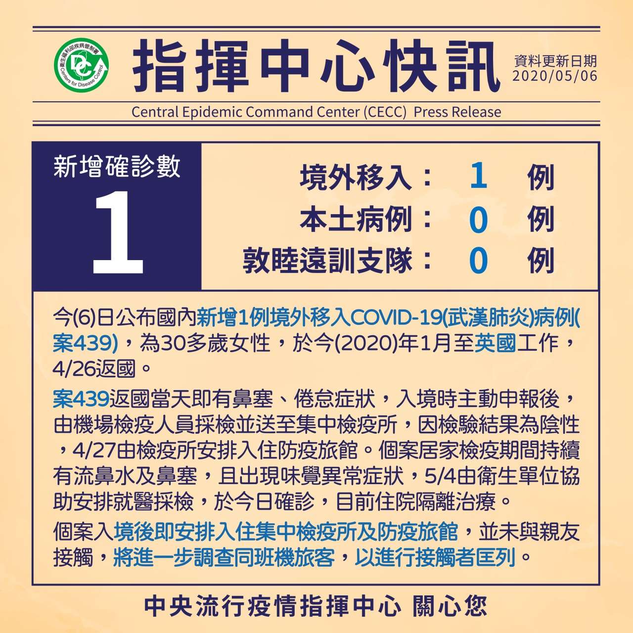 今(6)日公布國內新增1例境外移入COVID-19(武漢肺炎)病例(案439),為30多歲女性,於今(2020)年1月至英國工作,4/26返國。
