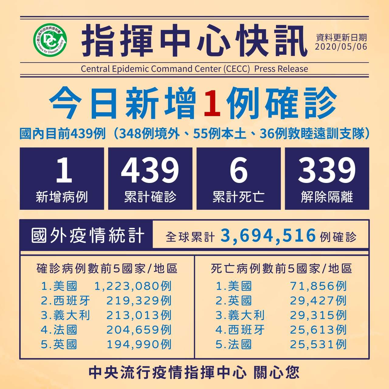 國內目前累計439例確診(今日新增案439),分別為348例境外移入,55例本土病例及36例敦睦艦隊。確診個案中6人死亡,339人解除隔離,其餘持續住院隔離中。