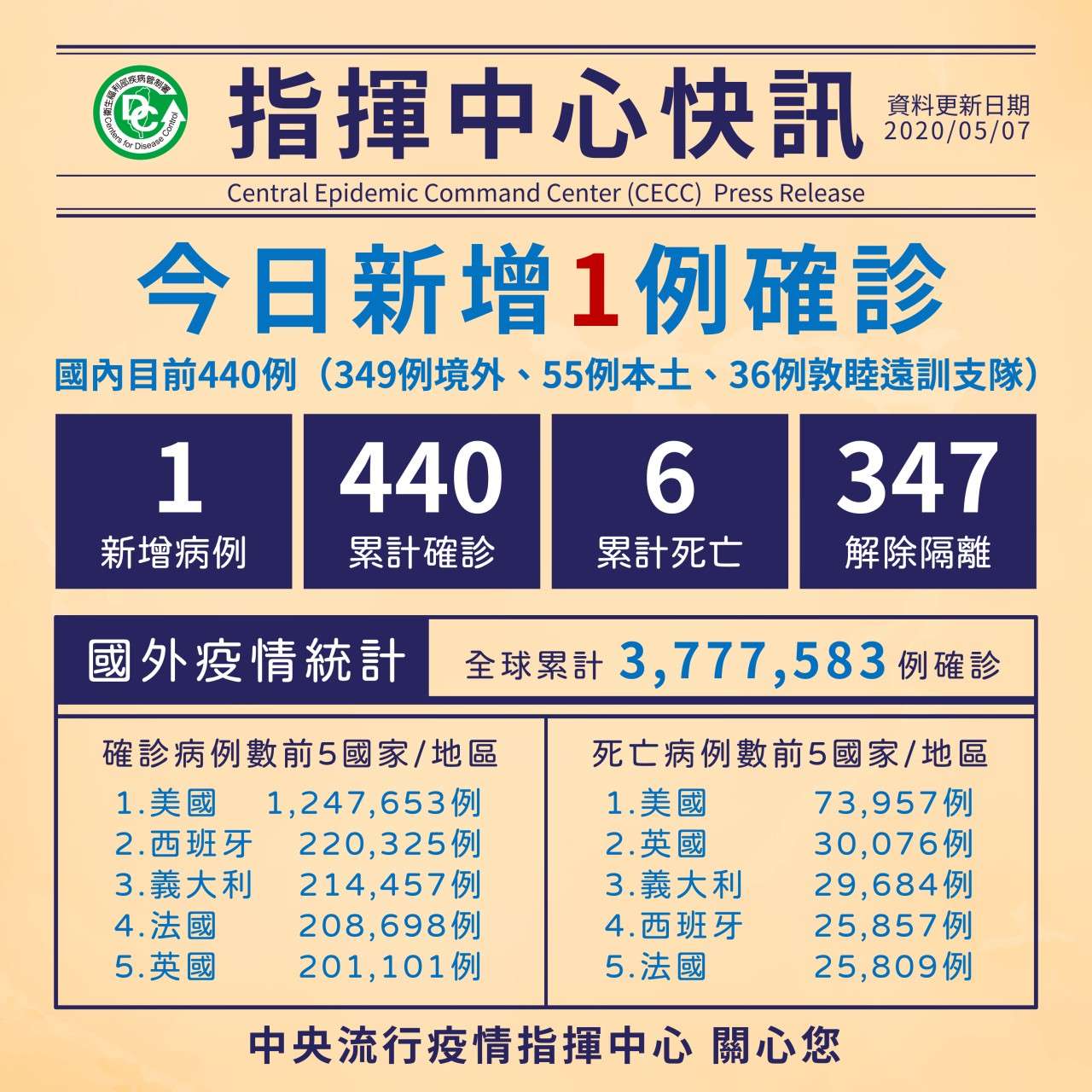 國內目前累計440例確診(今日新增案440),分別為349例境外移入,55例本土病例及36例敦睦艦隊。確診個案中6人死亡,347人解除隔離,其餘持續住院隔離中。
