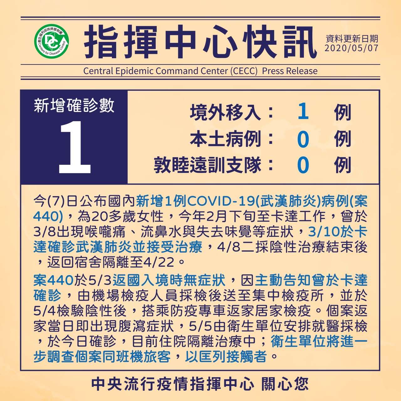 今(7)日公布國內新增1例COVID-19(武漢肺炎)境外移入病例(案440),為20多歲女性。