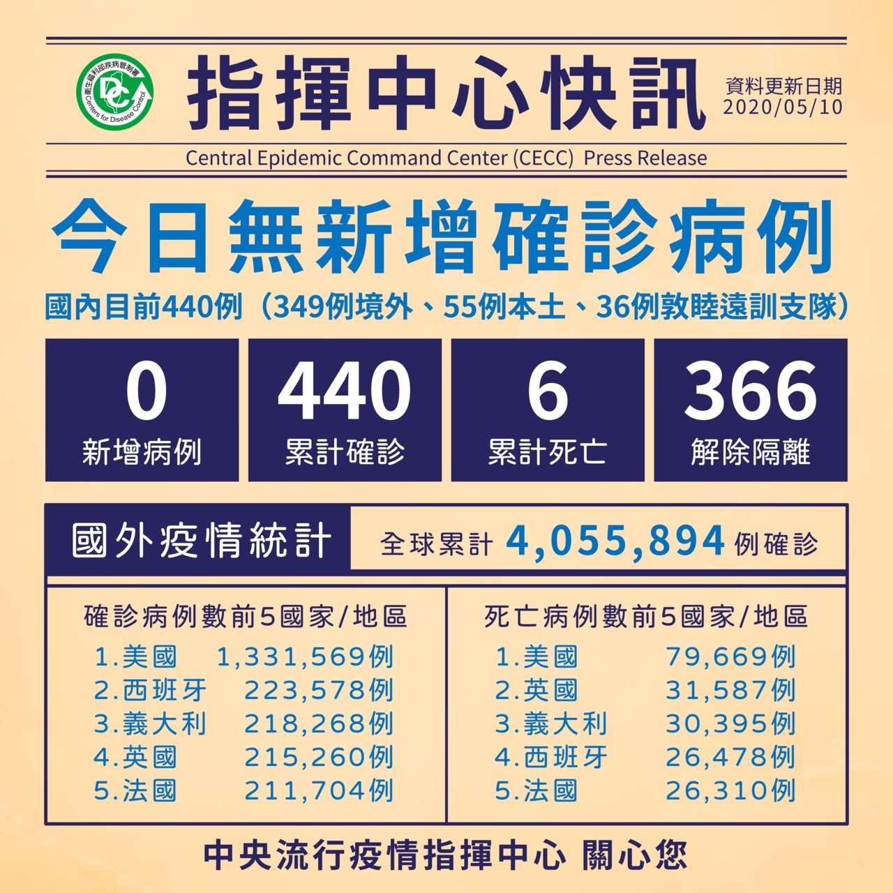 今(10)日無新增確診病例,國內維持440例確診,分別為349例境外移入,55例本土病例及36例敦睦艦隊。確診個案中6人死亡,366人解除隔離,其餘持續住院隔離中。