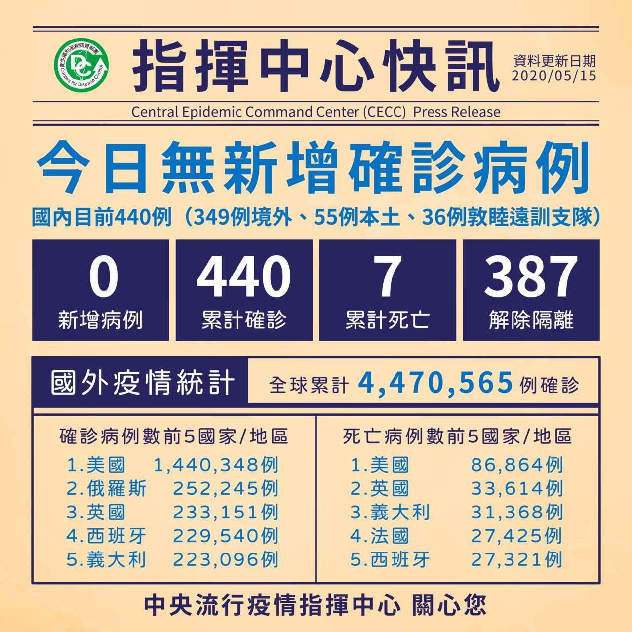 今(15)日無新增確診病例,國內維持440例確診,分別為349例境外移入,55例本土病例及36例敦睦艦隊。確診個案中7人死亡,387人解除隔離,其餘持續住院隔離中。
