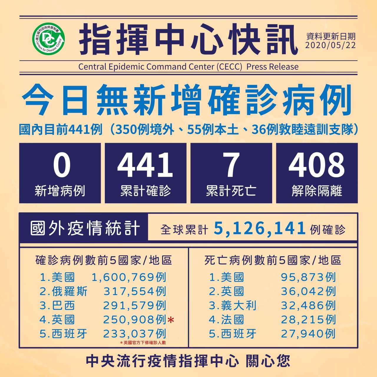 (今(22)日無新增確診病例,國內維持441例確診,分別為350例境外移入,55例本土病例及36例敦睦艦隊。確診個案中7人死亡,408人解除隔離,其餘持續住院隔離中。