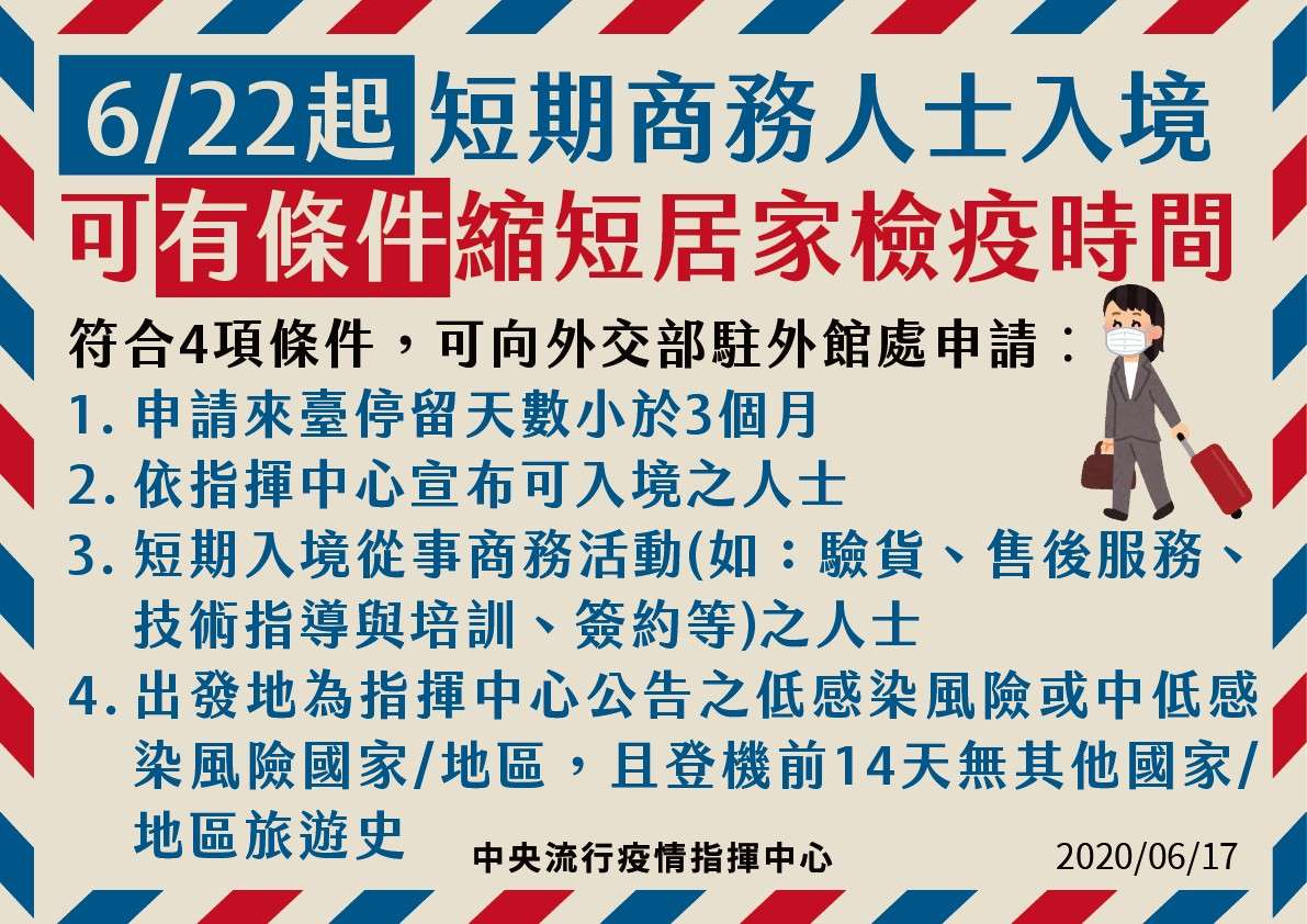 中央流行疫情指揮中心今(17)日表示,自6/22起,短期商務人士若同時符合以下四項基本條件,可申請縮短居家檢疫時間︰