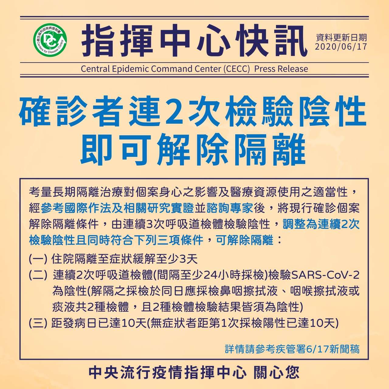 中央流行疫情指揮中心今(17)日表示,考量長期隔離治療對個案身心之影響及醫療資源使用之適當性,經參考國際作法及相關研究實證並諮詢專家後,將現行確診個案解除隔離條件,由連續3次呼吸道檢體檢驗陰性,調整為連續2次檢驗陰性即可解除隔離。
