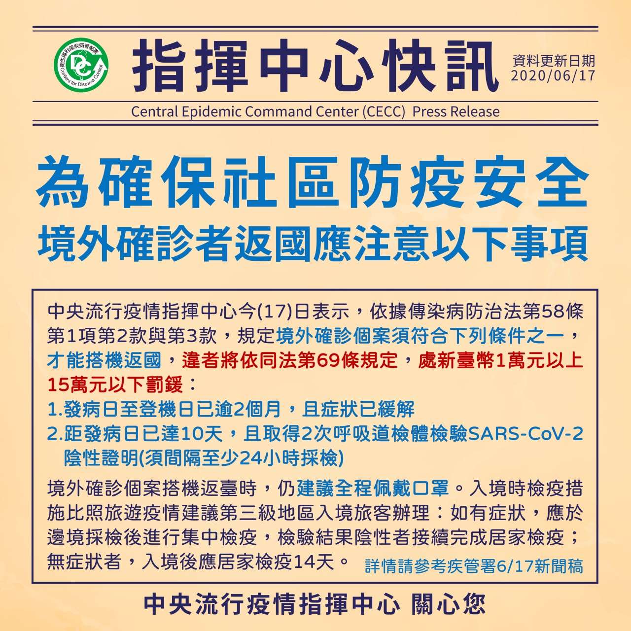 依據傳染病防治法第58條第1項第2款與第3款,規定境外確診個案須符合下列條件之一,才能搭機返國,違者將依同法第69條規定,處新臺幣1萬元以上15萬元以下罰鍰:
