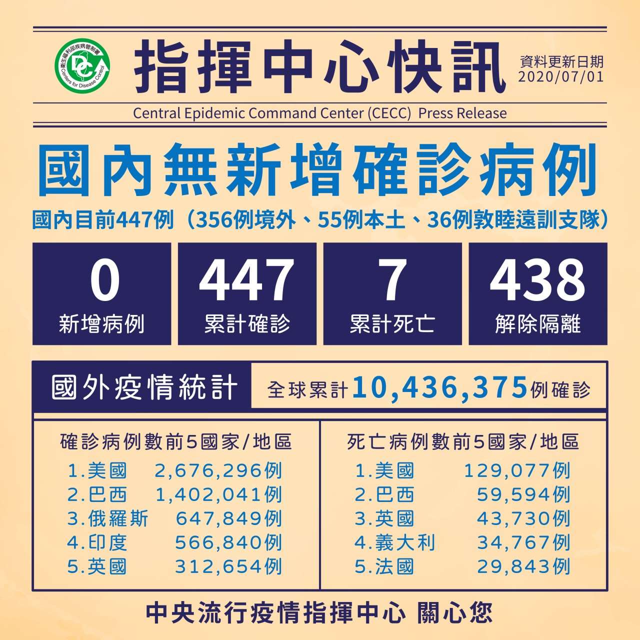 今(1)日無新增確診病例,國內維持447例確診,分別為356例境外移入,55例本土病例及36例敦睦艦隊。確診個案中7人死亡、438人解除隔離、2人住院隔離中。