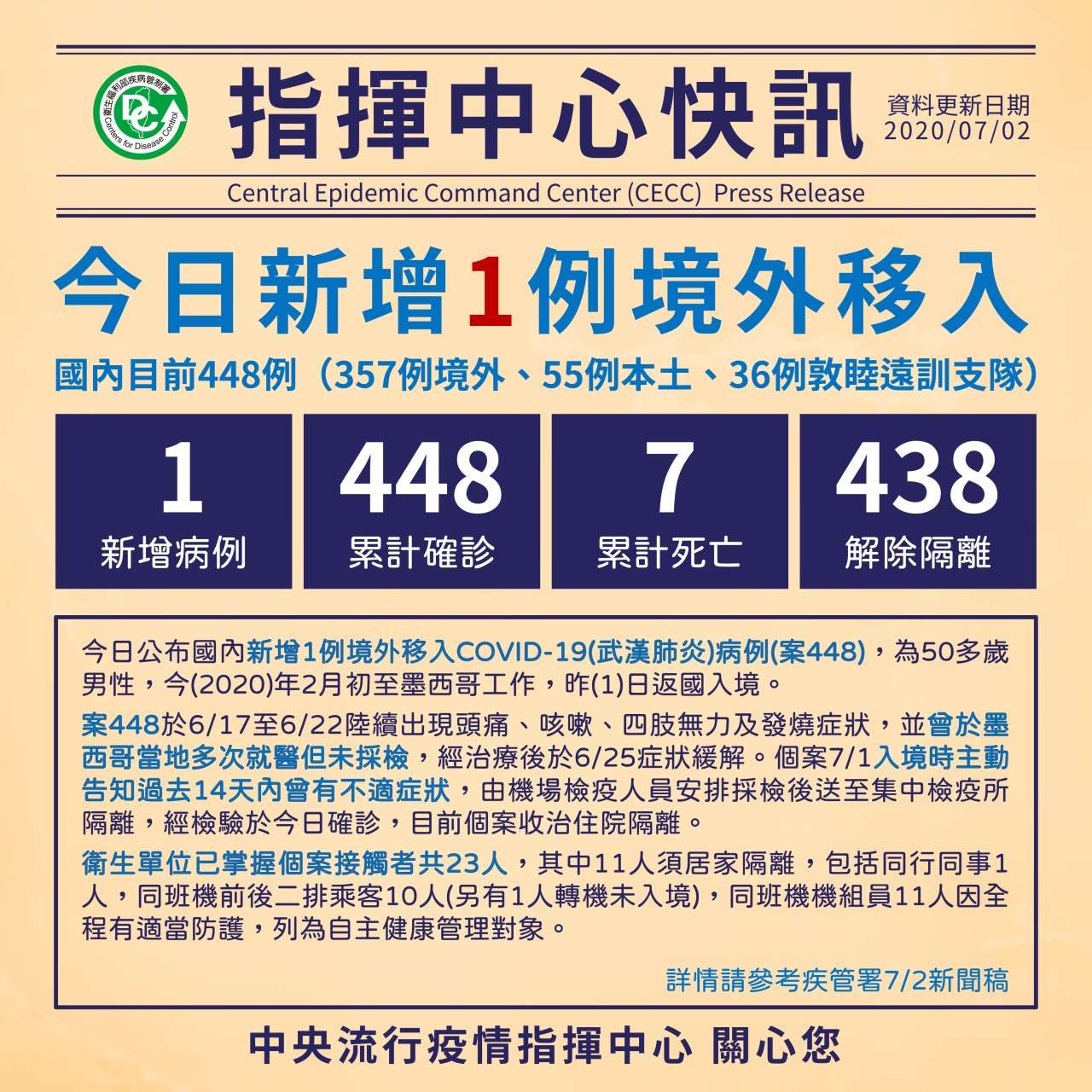 中央流行疫情指揮中心今(2)日公布國內新增1例境外移入COVID-19(武漢肺炎)病例(案448),為50多歲男性,今(2020)年2月初至墨西哥工作,昨(1)日返國入境。