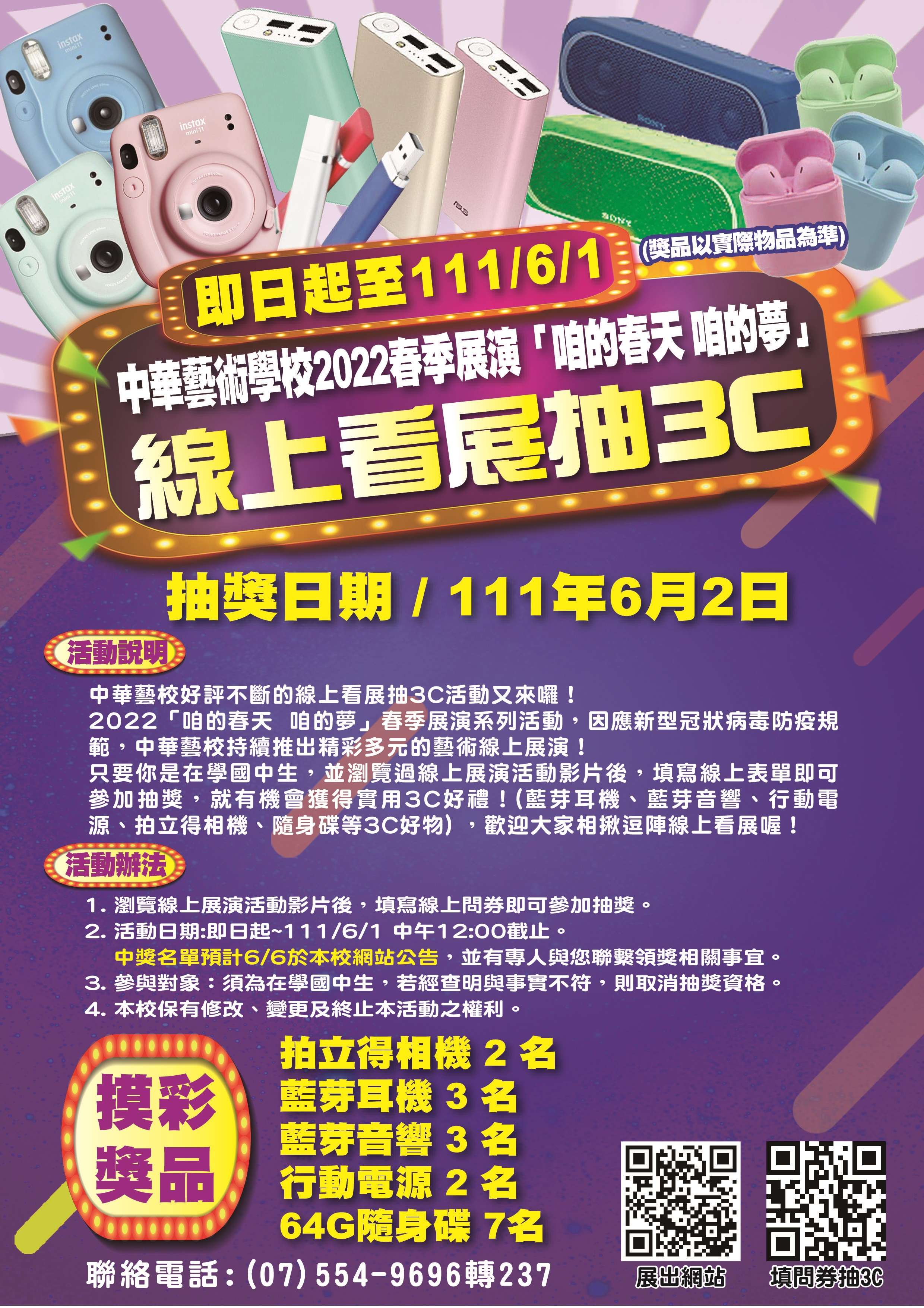 一、因應新型冠狀病毒防疫規範,中華藝校特別推動藝術線上展演,瀏覽線上展演活動影片後填寫線上問卷即可參加抽獎活動。