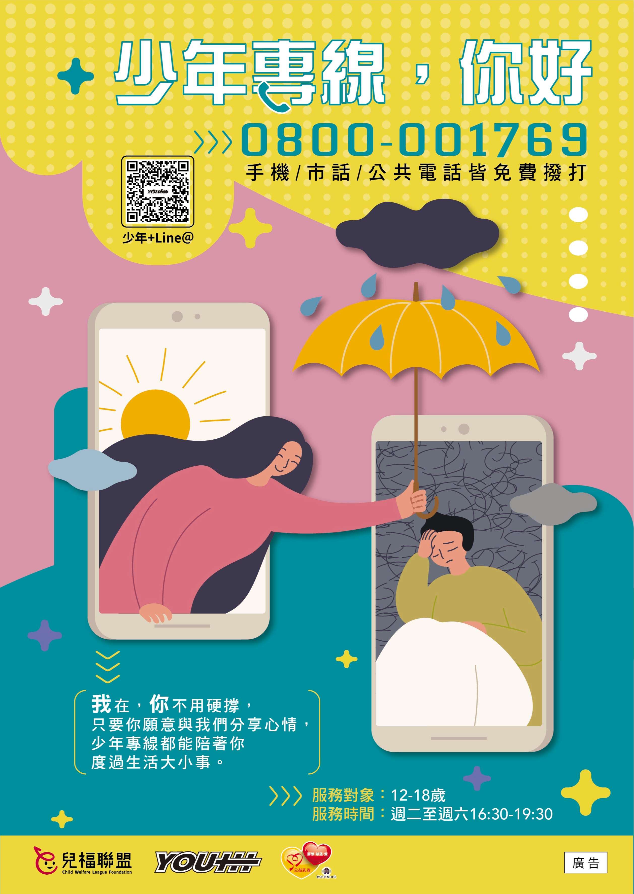 本會辦理「兒福聯盟-少年專線服務(0800-001769)」,提供全台12歲至18歲之少年免付費電話諮詢服務,服務時間為每週二至週六下午4:30至7:30。期待透過此專線傾聽少年的需求,協助其抒發壓力,並引導、陪伴他們面對和解決困難。