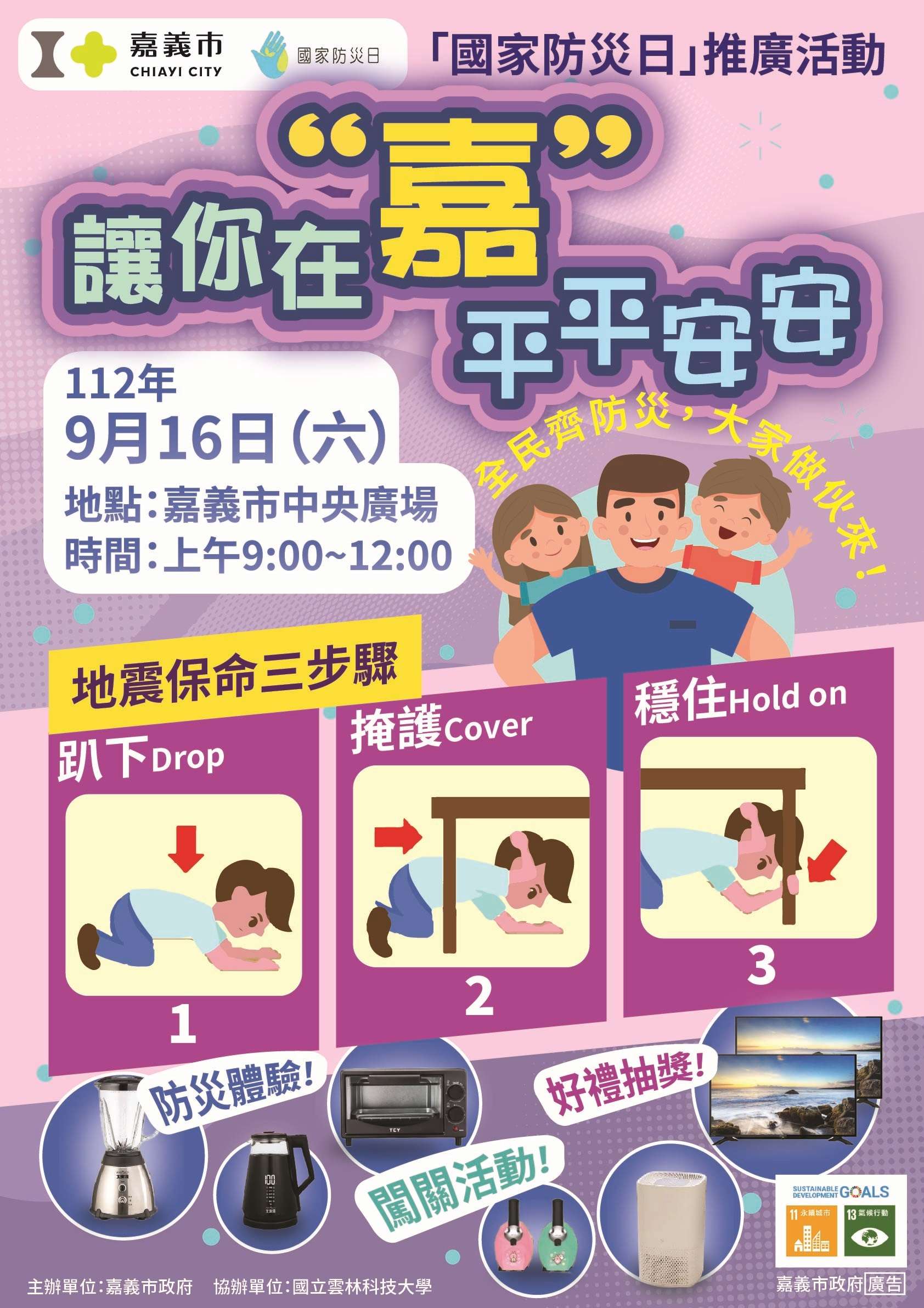 二、旨案活動訂於本(112)年9月16日(週六)9時至12時假中央廣場(文化路與民權路口)辦理宣導活動,透過現場各類攤位宣導資訊及互動體驗,喚起市民及社會各界重視自助、互助的重要性,達到精進全民防災之目標。