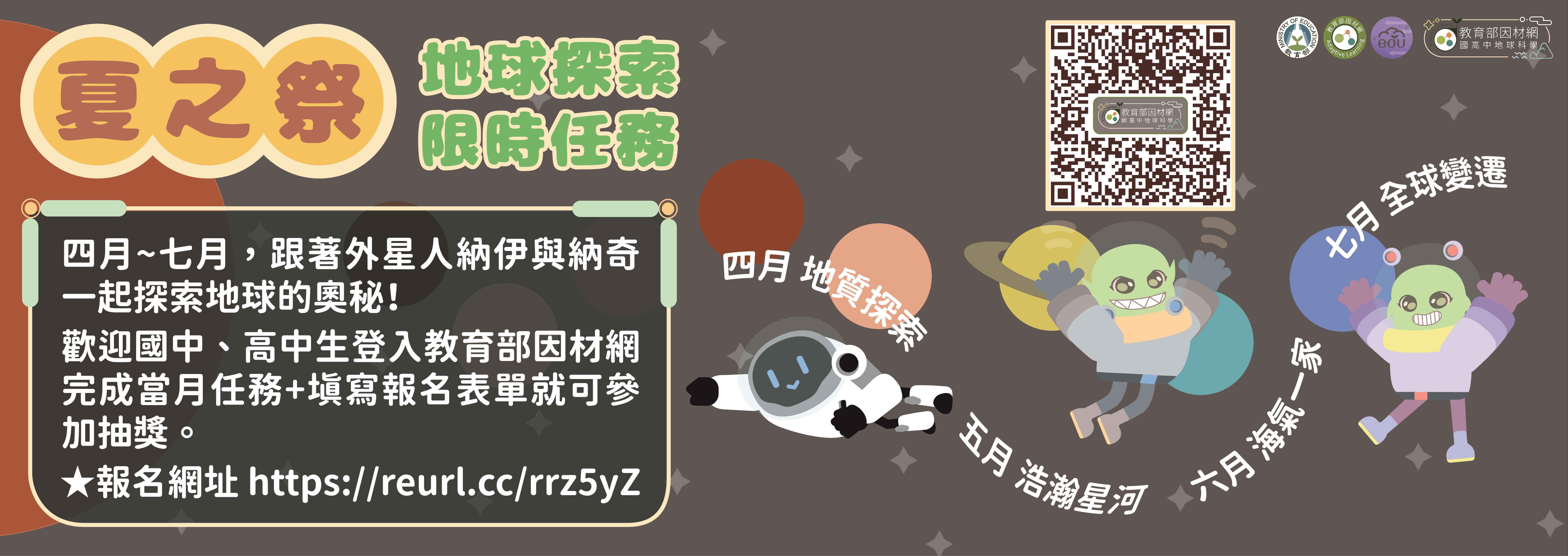 二、教育部因材網國高中地球科學數位學習教材以活潑有趣的「探究式對話」引導孩子用科學視角觀察生活中的自然現象,為中學階段學生自主探究學習的優質教材,可做為學生課前預習、課後複習用,亦可做為七、八年級學生以及高中學生自主學習與科展探究學習。為鼓勵學生自主探究與適性學習,促進親、師、生對於教育部因材網之推廣與應用,本年度四月到七月特辦理「夏之祭--地球探索限時任務」跨校學習活動,完成報名之國中、高中職同學即有機會參加科學好禮抽獎,登入說明與報名網址如下:https://reurl.cc/rrz5yZ。