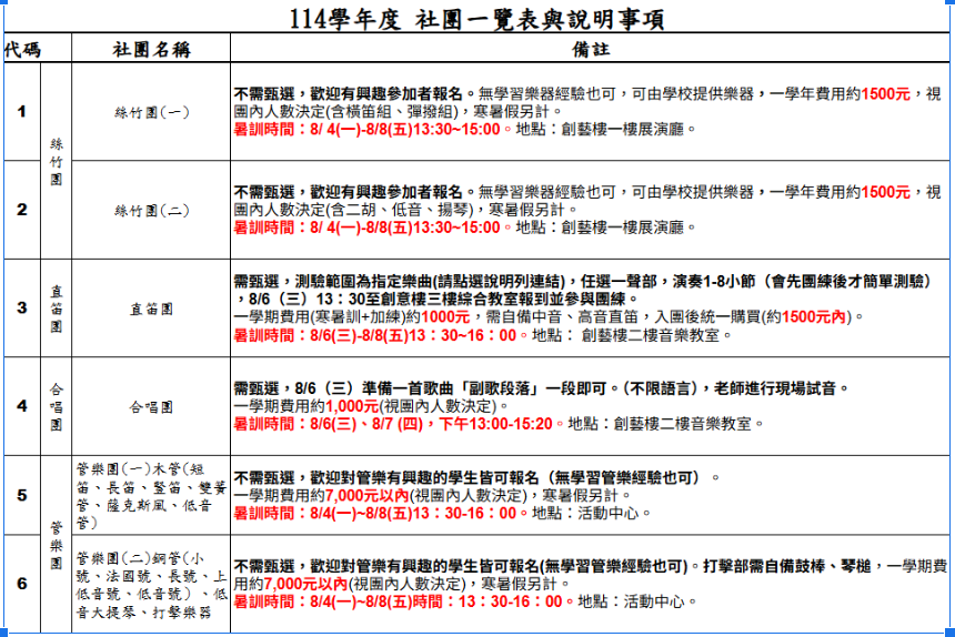 七年級新生欲報名音樂性社團(管樂、絲竹、直笛、合唱)